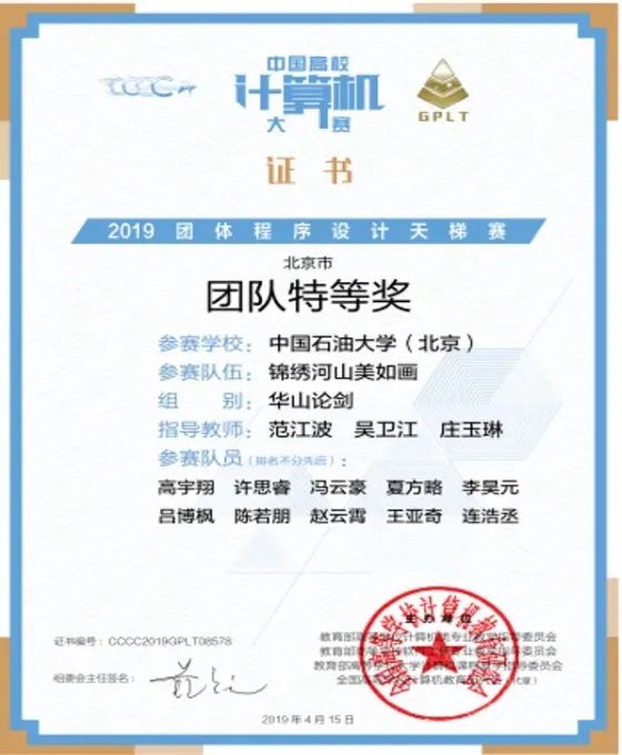 在全國程序設計“天梯賽”中,帶領隊員取得全國團隊金獎、北京市特等獎兼第一名的好成績,彰顯了中石大信息學子在信息學科競賽上的團體實力。