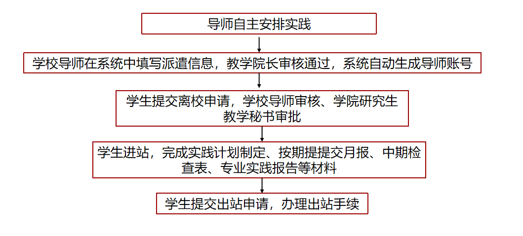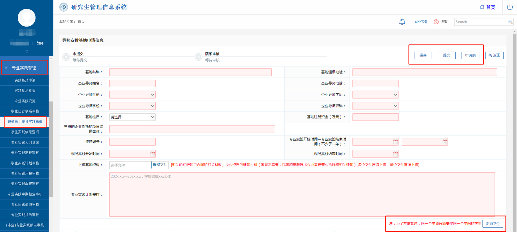 在【實踐過程管理】-【導師自主安排實踐申請】中進行申請,填寫單位信息、企業導師信息,上傳在研項目合同等相關材料;同時安排學生(同一個申請只能安排同一個學院的學生);