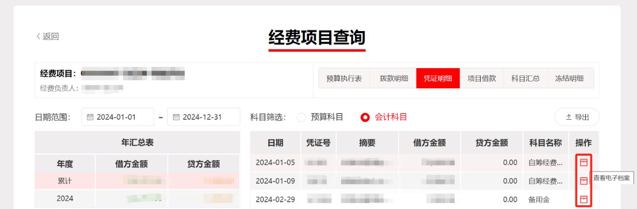 方式2:通過經(jīng)費項目查詢,此方式查看經(jīng)費項目下的電子憑證。查詢步驟:登錄綜合財務(wù)信息平臺,【信息查詢】-【經(jīng)費項目查詢】-【選擇經(jīng)費項目】-【憑證明細】,在操作列點擊查看電子檔案。