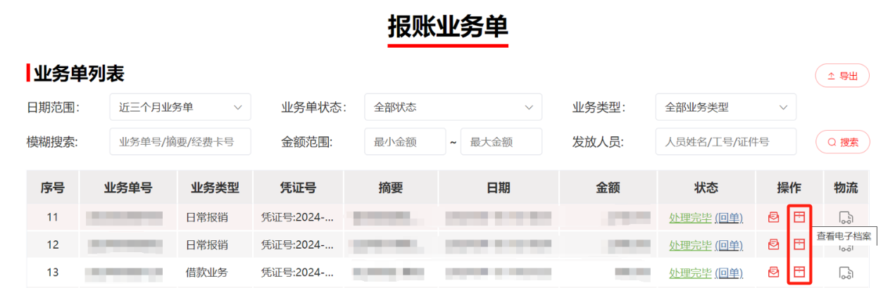 方式1:通過報賬業(yè)務(wù)單查詢,此方式查看已處理完畢的單個業(yè)務(wù)單電子憑證。查詢步驟:登錄綜合財務(wù)信息平臺,【業(yè)務(wù)辦理】-【報賬業(yè)務(wù)單】,在業(yè)務(wù)單操作列點擊查看電子檔案。