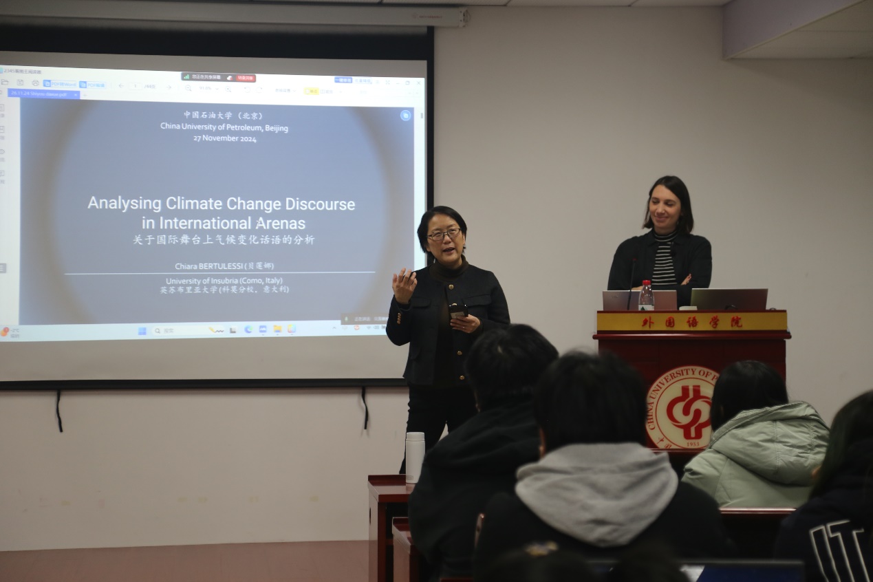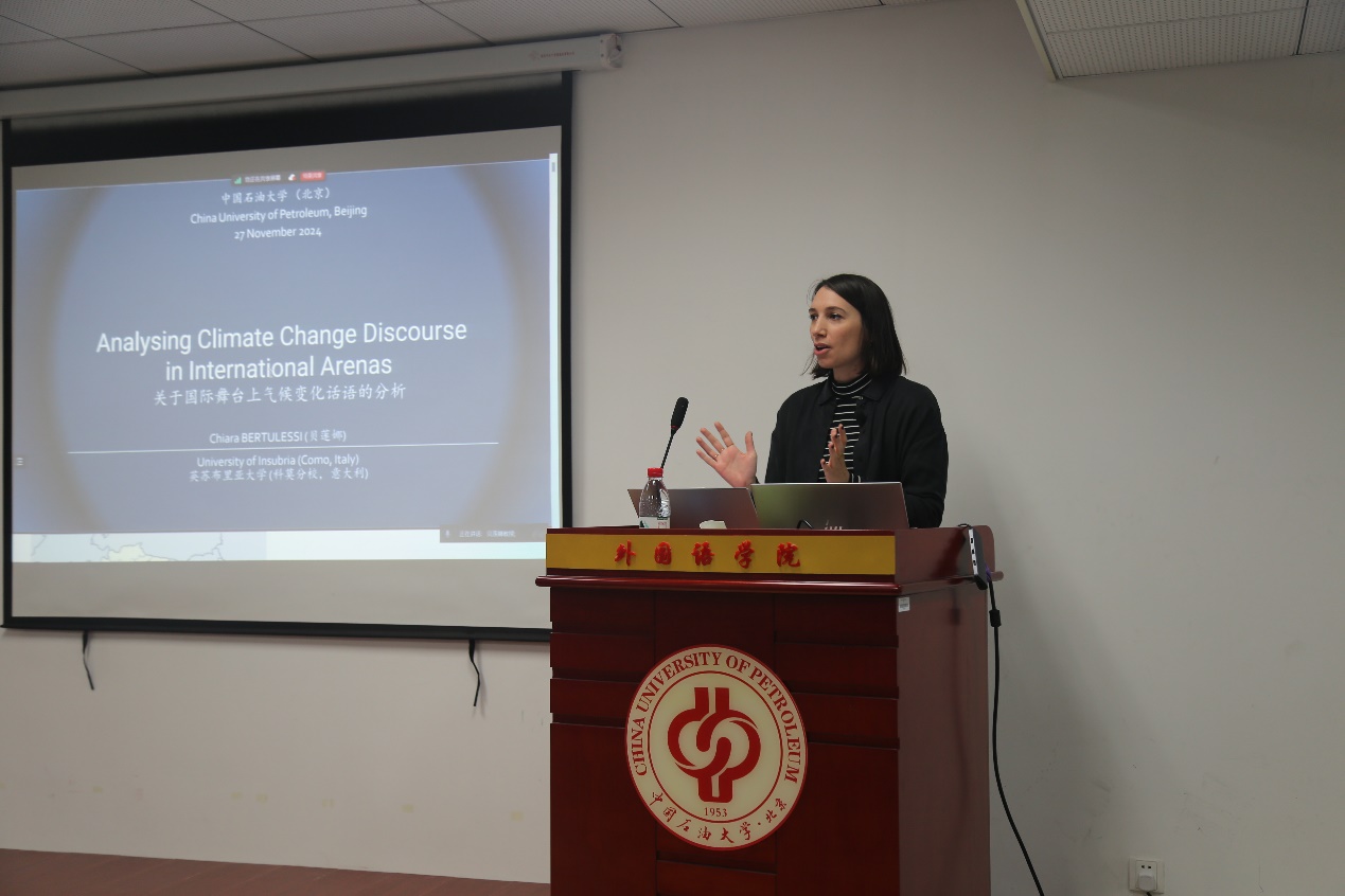 11月26日,外國語學院開展第69期博雅講壇,意大利因蘇布里亞大學(University of Insubria)Chiara Bertulessi助理教授受邀以“Analysing Climate Change Discourse in International Arenas: A Focus on UN Contexts”為題做了主旨報告,學院院長趙秀鳳教授主持講座,田海龍、崔亞霄等80余名師生參加講座。