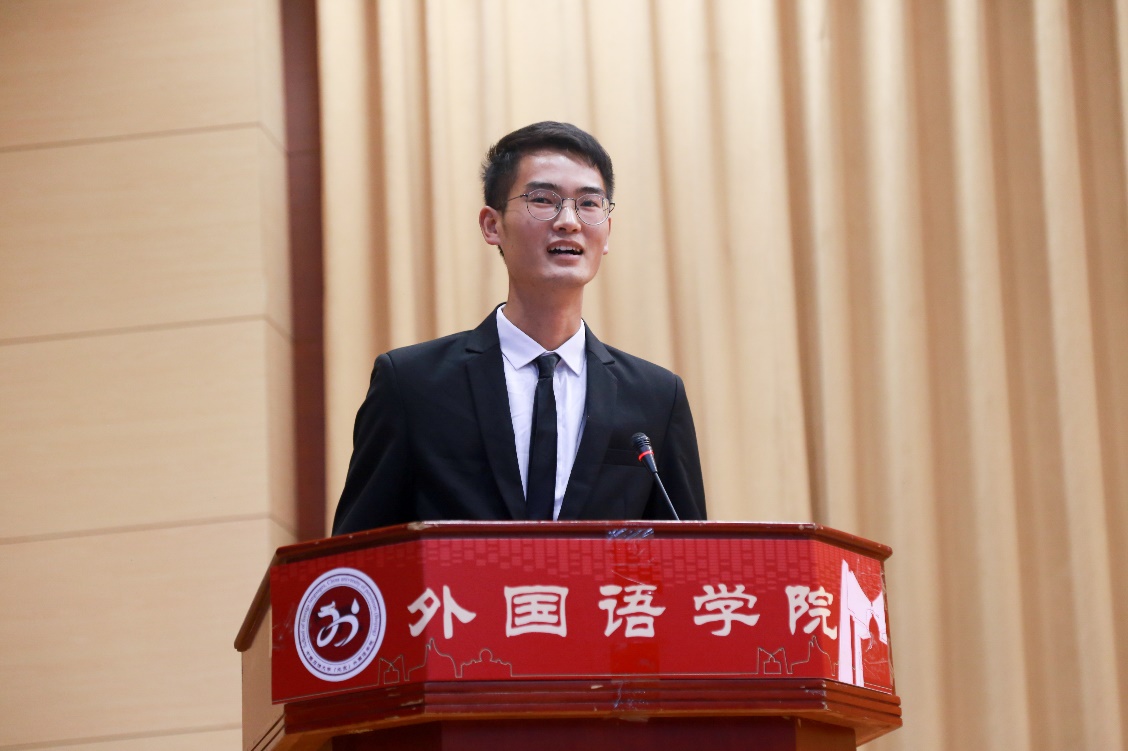 研究生新生代表2020級碩士研究生楊哲同學發(fā)言。楊哲同學感慨本科四年外國語學院對他的巨大幫助,今后作為一名研究生會更加以嚴格的標準要求自己,以實際行動報答學院老師的辛勤栽培,為學院貢獻自己的力量。最后,在外國語學院20歲生日之際,楊哲同學向?qū)W院表達了美好的祝愿。