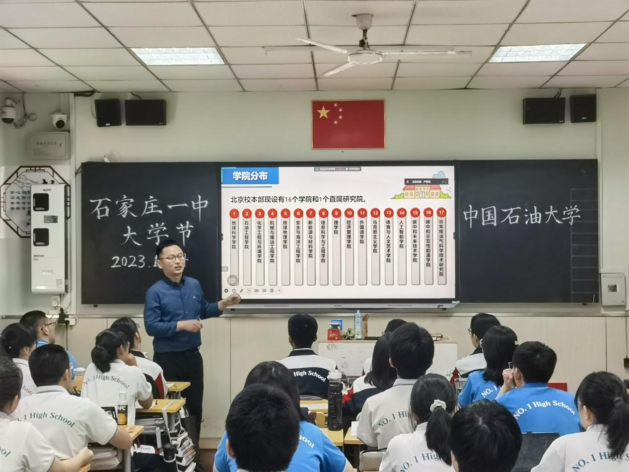 10月13-14日,河北省石家莊市第一中學舉行2023年“大學節”活動,全國50余所高校參加。中國石油大學(北京)外國語學院公共英語黨支部書記趙春龍和2021級英語專業本科生辛宜原代表學校參加活動。開幕式由石家莊一中副校長馬瑞華主持,黨委書記婁延果致辭。