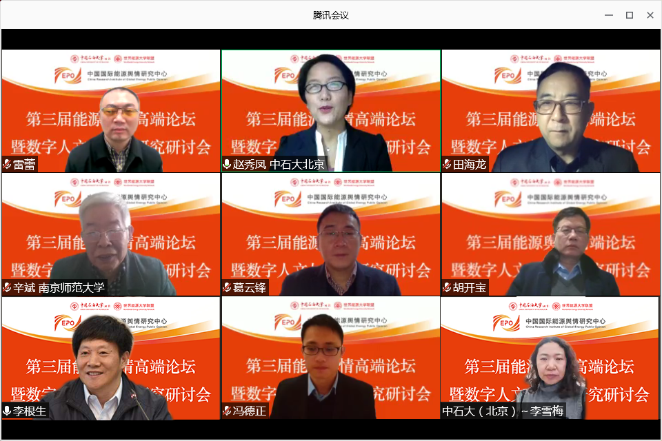 為深入貫徹“新文科”建設(shè)精神,推動(dòng)結(jié)合校本特色的跨學(xué)科融合,12月17日至18日,中石大外國(guó)語(yǔ)學(xué)院和世界能源大學(xué)聯(lián)盟秘書(shū)處聯(lián)合主辦了第三屆能源輿情高端論壇暨數(shù)字人文與話語(yǔ)研究研討會(huì)。本次會(huì)議由中國(guó)國(guó)際能源輿情研究中心承辦,中國(guó)英漢語(yǔ)比較研究會(huì)話語(yǔ)研究專業(yè)委員會(huì)和專門用途英語(yǔ)專業(yè)委員會(huì)能源英語(yǔ)分會(huì)提供學(xué)術(shù)支持。來(lái)自國(guó)內(nèi)外多所高校及機(jī)構(gòu)的500余位專家學(xué)者和青年學(xué)子在線參與了本次論壇,近1500名觀眾收看了本次論壇現(xiàn)場(chǎng)的視頻直播。