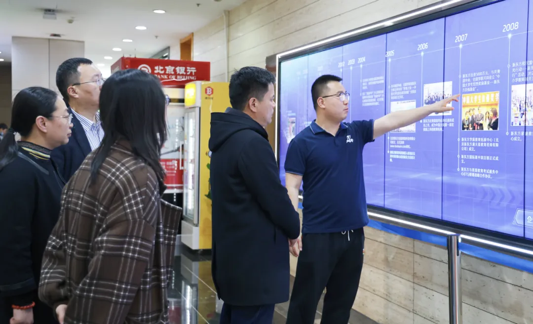 會前,周玉成一行在武中豪的帶領下,參觀了“新東方閱讀空間”,并通過智能大屏對新東方的品牌文化理念、集團業務體系、發展歷程、社會責任等各方面情況進行了全方位了解。