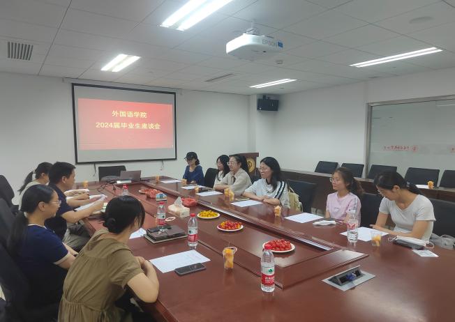 6月27日,外國語學院于主樓A724會議室召開2024屆畢業生座談會。外國語學院黨委書記周玉成、黨委副書記劉春陽、副院長崔亞霄、研究生畢業班輔導員諶叢、本科生畢業班輔導員王芃月及本研畢業生代表參加會議。