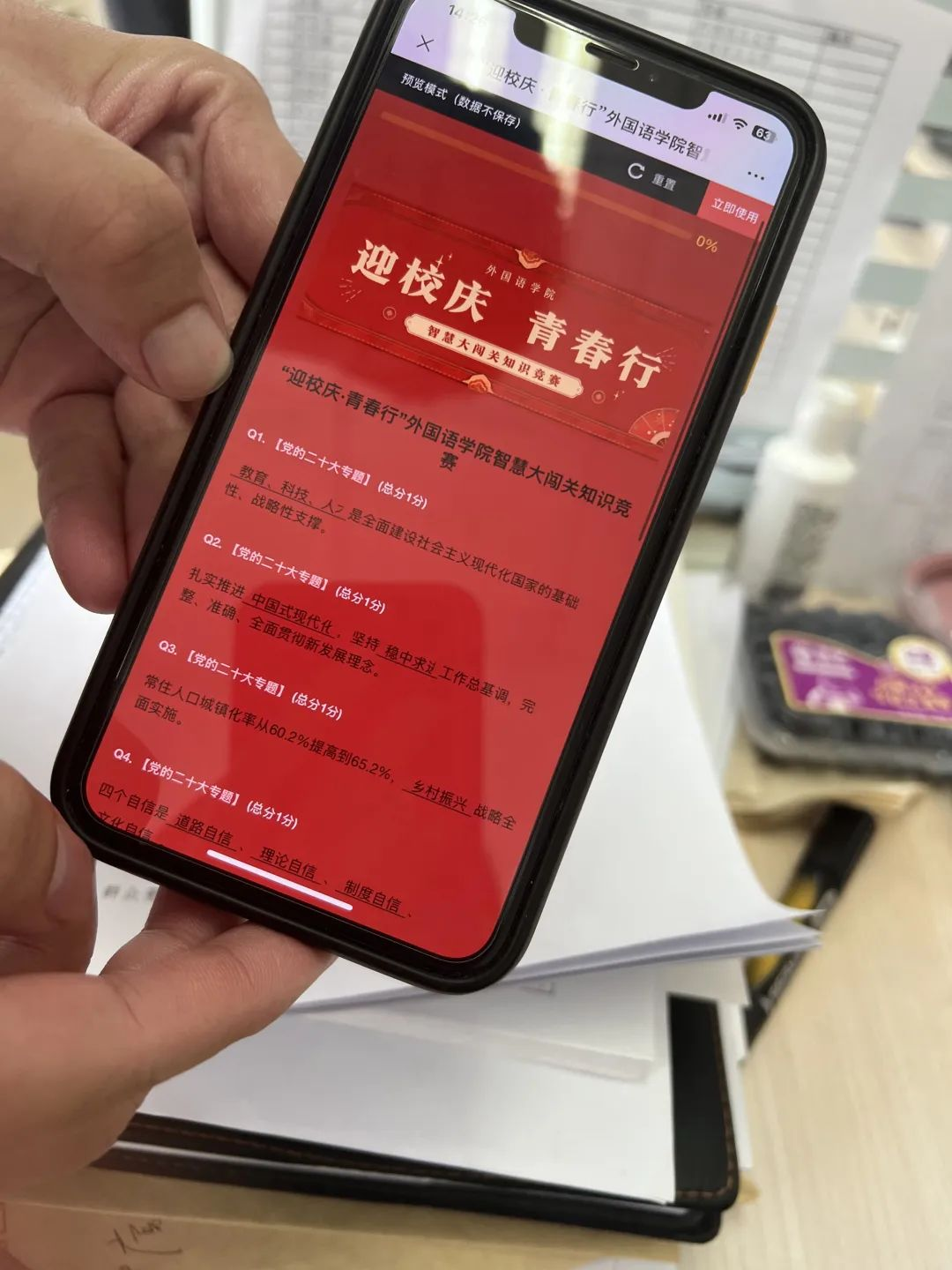 借喜迎校慶之機(jī),以歷史為底蘊(yùn),以青春為內(nèi)核,外國(guó)語學(xué)院于4月10日-14日面向全院學(xué)生組織開展以“迎校慶·青春行”為主題的知識(shí)答題活動(dòng)。此次知識(shí)答題活動(dòng)將黨的二十大精神、全國(guó)兩會(huì)精神,以及校史相關(guān)題目與英語學(xué)科特色相結(jié)合,共設(shè)立70道學(xué)習(xí)題目。