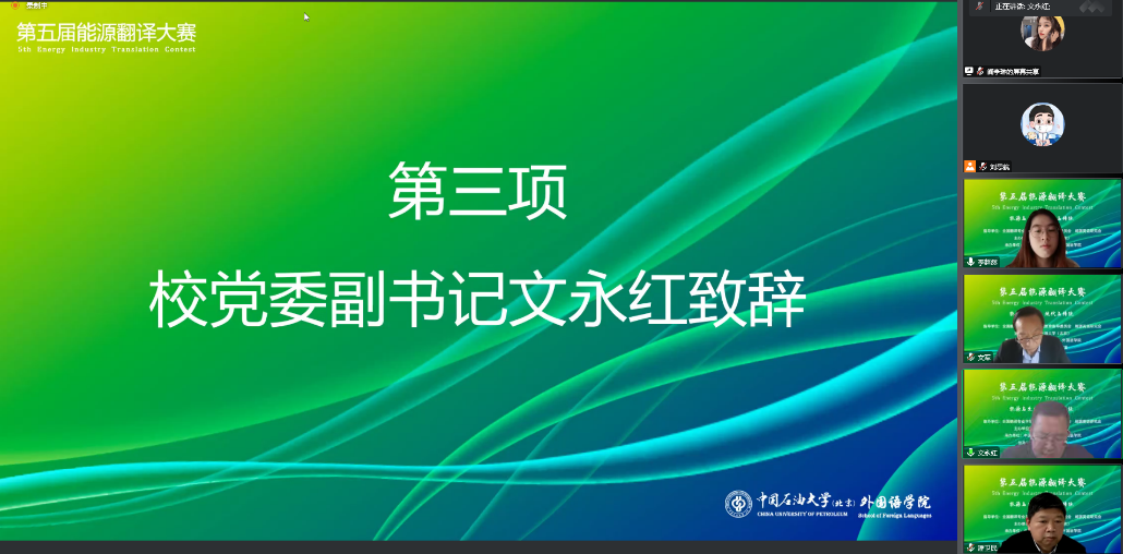 2022年12月29日,第五屆能源翻譯大賽決賽在中國石油大學(xué)(北京)以線上形式舉行。大賽邀請北京航空航天大學(xué)外國語學(xué)院文軍教授,上海電力大學(xué)外國語學(xué)院院長潘衛(wèi)民,哈爾濱工業(yè)大學(xué)外國語學(xué)院副教授、翻譯教學(xué)與研究中心主任鄭淑明,南京林業(yè)大學(xué)教授肖飛,東北石油大學(xué)外國語學(xué)院副院長、副教授喬洪亮,中國石油大學(xué)(北京)外國語學(xué)院副院長徐方富擔(dān)任評委。中石大黨委副書記文永紅、外國語學(xué)院院長趙秀鳳參加閉幕式并致辭。