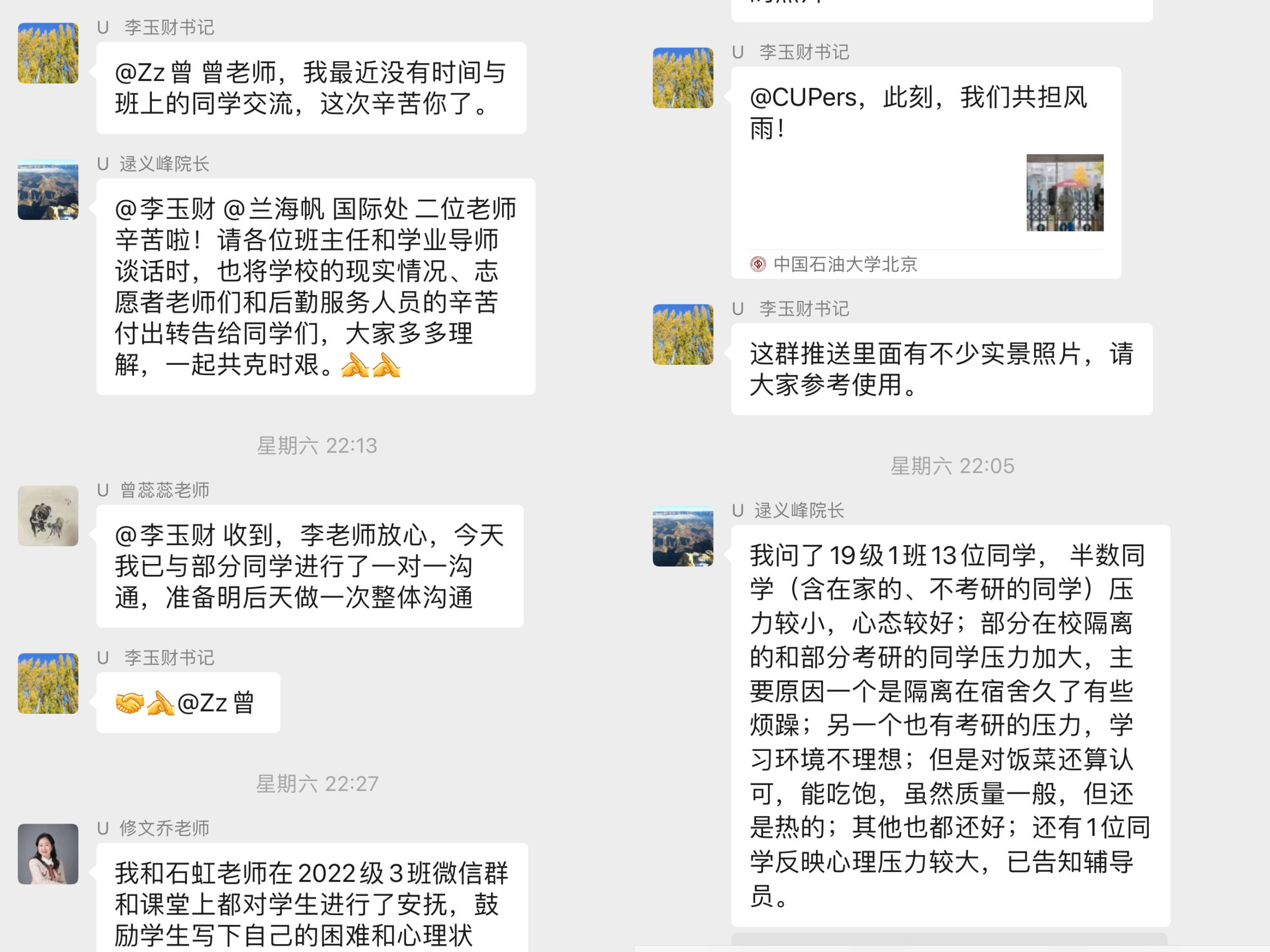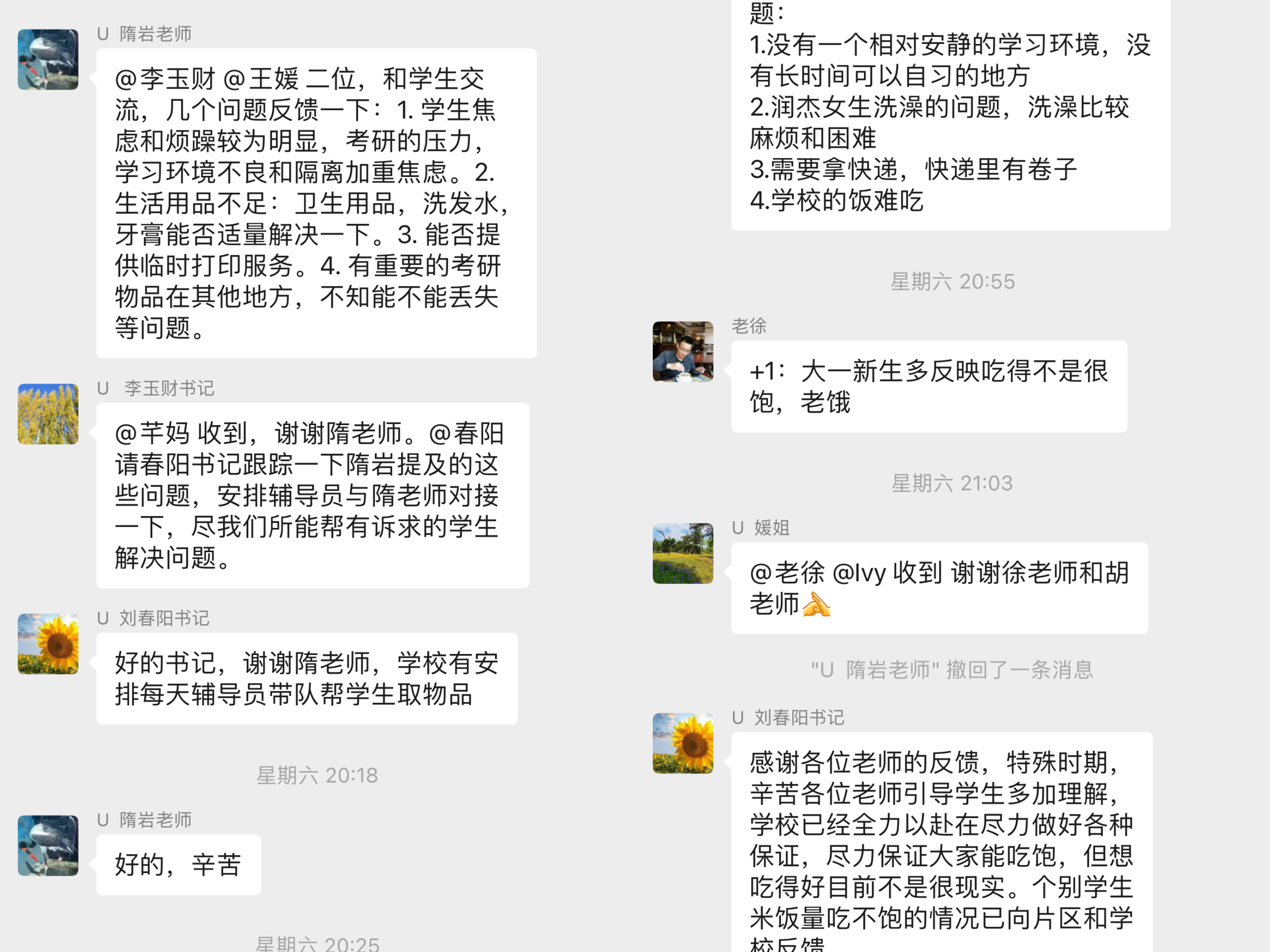 班主任和學業導師們都通過各種方式表達了在特殊時期,對于學生的關愛之情,敦促學生們做好防護,配合學校防疫工作,引導學生理解學校、學院所做出的各種努力。針對學生反映的各種問題,比如:生活用品短缺、需要打印、運送學習材料等等,學院第一時間給予了反饋,竭盡所能予以解決。