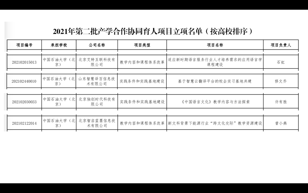近日,在教育部高等教育司公布2021年第二批產(chǎn)學(xué)合作協(xié)同育人項(xiàng)目立項(xiàng)的名單中,我院有四位教師喜獲立項(xiàng),立項(xiàng)名稱分別是“基于智慧云翻譯平臺(tái)的校企實(shí)習(xí)基地共建” (修文喬),“適應(yīng)新時(shí)期語(yǔ)言服務(wù)行業(yè)人才培養(yǎng)需求的應(yīng)用語(yǔ)言學(xué)”(石虹),“《中國(guó)語(yǔ)言文化》教學(xué)內(nèi)容與方法探索”(許有勝),“新文科背景下能源行業(yè)‘跨文化交際’教學(xué)資源建設(shè)”(曾小燕)。