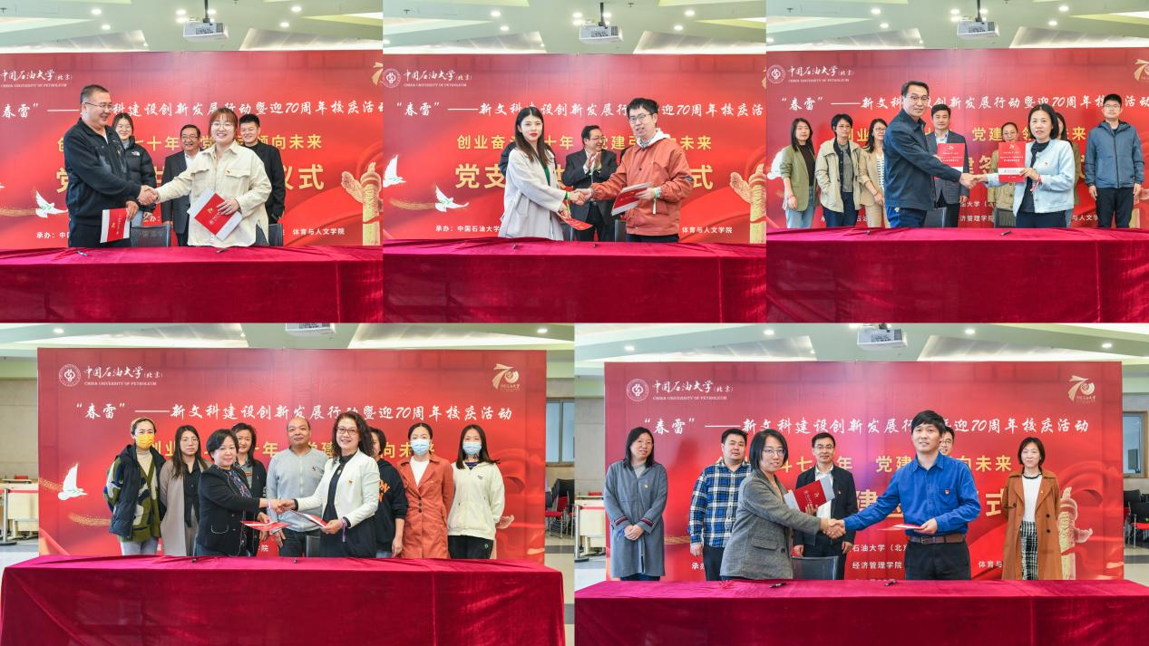 4月25日下午,“春雷”—新文科建設創新發展行動暨迎七十周年校慶系列活動“創業奮斗七十年 黨建引領向未來”主題黨日活動暨黨支部共建簽約儀式在中國石油大學(北京)舉行。中石化石油勘探開發研究院油氣戰略與規劃研究所黨支部、昌平區流村鎮政府機關第一黨支部、昌平區文聯第一聯合黨支部等10個校內外黨支部的黨員代表和校友代表近40人參加活動。活動由經濟管理學院、馬克思主義學院、外國語學院和體育與人文藝術學院共同承辦。
