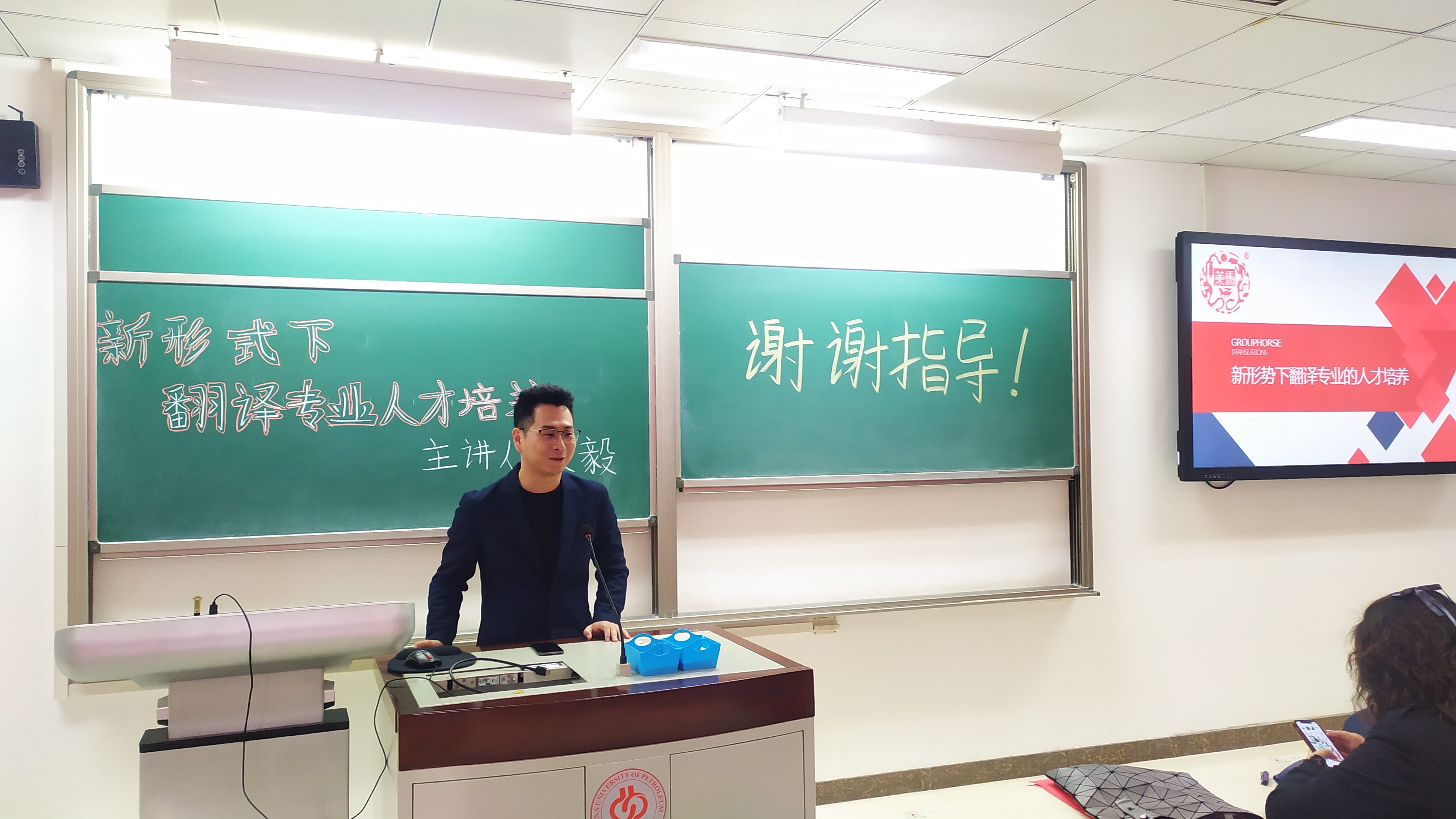 崔亞霄副院長致辭,對策馬翻譯有限公司進行了介紹,并對公司代表文毅總經理和郭艷卿老師的到來表示歡迎。文毅先生在講座中首先從國內外新形勢出發,結合自身工作經驗,指出語言服務行業具有廣闊的發展前景。在此基礎上,他從國家、社會、企業、高校和學生等多層面出發,提出新形勢下翻譯人才培養的諸多建議,特別強調應結合學校特色,以實踐為核心,利用翻譯技術提高工作效率。最后,文毅先生介紹了策馬集團語言服務實習項目,邀請同學們積極參與實踐,提高專業能力,豐富社會經驗。在問答環節,學生就實習相關細節進行提問,文毅和郭艷卿兩位老師進行了細致耐心的解答。