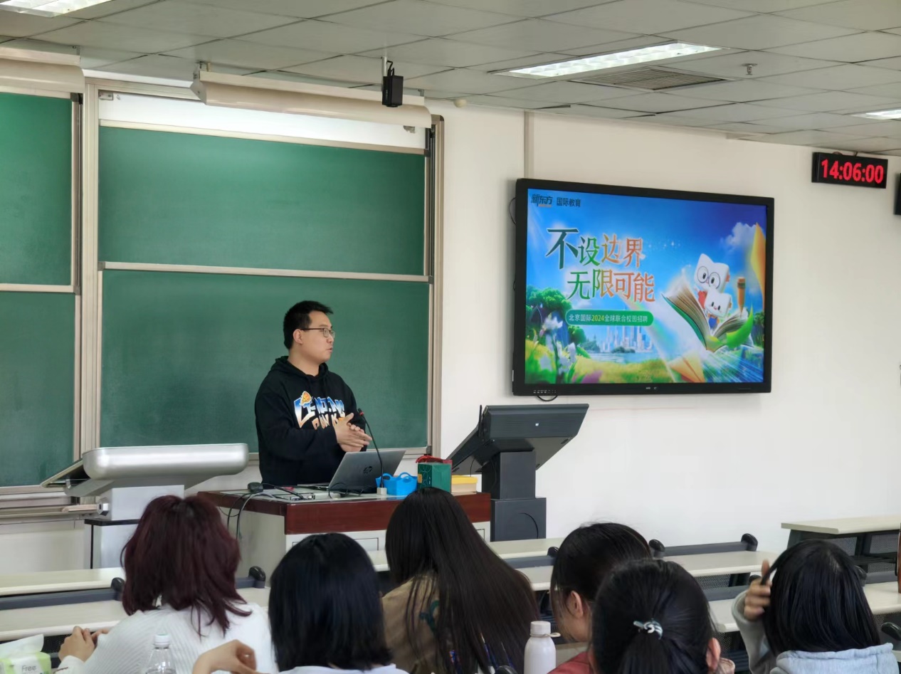 會上,北京市新東方培訓學校有限公司的武老師以“不設邊界 無限可能”為主題,從公司的創立、發展以及福利待遇等方面介紹了公司的基本情況,并對公司的工作崗位、培養方式、招收計劃等內容進行詳細講解,使同學們對北京市新東方培訓學校有限公司有了全面的了解。