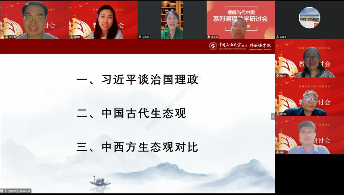5月9日,英語系主任唐萌萌老師就“習近平生態文明思想”主題進行了細致深入的講解,并在中華智慧傳承與中外文明互鑒的維度上挖掘課程思政資源,提高師生文化自覺與理論自信。在前一期的研討中,胡大為老師為大家講解了“高質量發展”理念,并針對新時代能源產業高質量發展分享了學界的觀點。團隊成員深受啟發,分享各自學習心得與真知灼見。