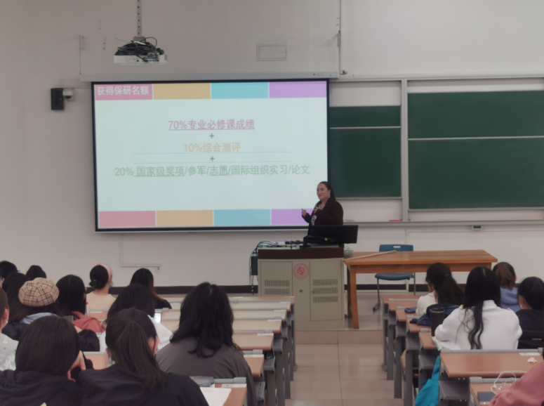 3名優秀學生代表分享了各自的求學經歷及成長歷程。研究生國家獎學金獲得者翻譯2019級學生宋冰冰,分享了在中石大的6年求學經歷;從大一時對學習的心不在焉到產生興趣,再到研究生的勤奮刻苦,巨大的轉變離不開心態、意志和思想的轉變。他勵志自強的奮斗旅程深深地感染了在場的每一位同學。保研到北京外國語大學的英語2017級學生陳阿麗娜分享保研的過程、經驗和個人的心路歷程。英語2017級學生王圣釗介紹了學院本碩一體化培養項目的相關內容和個人心理轉變過程,讓同學們對語言學研究的成長道路有了直接的了解。