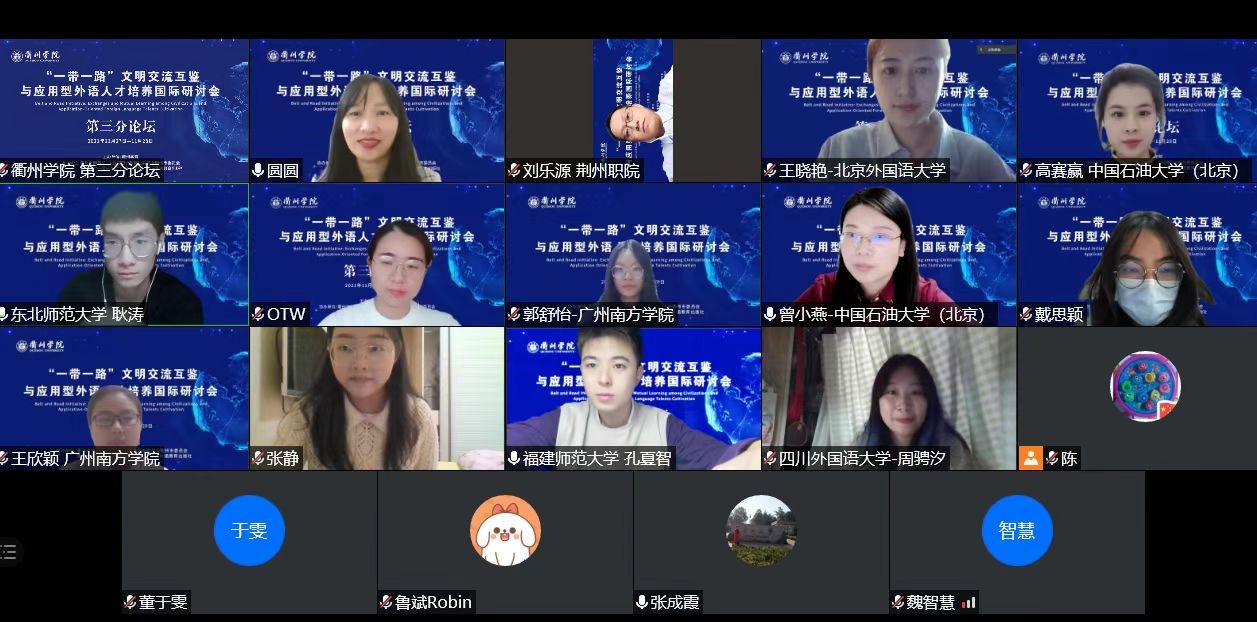 2021年11月27日和28日,我院曾小燕老師帶領周睿涵、高賽贏兩位同學參加了“一帶一路”文明交流互鑒與應用型外語人才培養國際研討會,該會議是由衢州學院主辦,衢州市商務局、中國國際貿易促進委員會衢州市委員會、廈門大學一帶一路漢學文化總中心、上海外語教育出版社協辦。