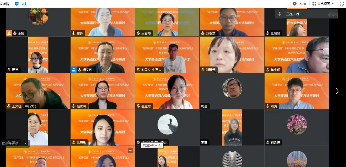 為深入學習貫徹黨的二十大精神,全面落實立德樹人根本任務,迎接新一輪本科教育教學審核評估工作,深入開展本科教育教學思想大討論,10月26日下午,外國語學院邀請華南理工大學教授崔玲在線開展了題為“大學英語四六級教學方法與研討”的講座。學院院長趙秀鳳、副院長逯義峰、公共英語教學部全體教師、英語系部分教師參加講座,逯義峰主持講座。