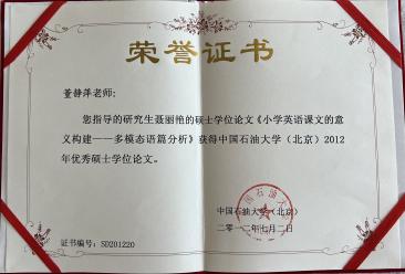 “要想給學生一杯水,自己要至少有一桶水。”董靜萍深刻理解這個道理。她在任教期間從未間斷自修和進修,不斷學習讓她對自己的教學能力充滿信心。作為骨干教師,她曾教授全脫產石油系統工程技術人員和干部的高級、中級、準中級各層次《精讀》《聽力》《視聽說》《翻譯》《職稱外語考試輔導》《商務綜合英語》《TOEFL考試輔導》等課程、本科生《大學英語》《綜合英語》《高級綜合英語》《英語聽力》、碩士生《系統功能語言學》《國外外語教學法流派》等課程,指導本科、碩士論文和創新創業實踐,培養出眾多行業精英和功勛;發表論文二十余篇,多次榮獲校級先進教師和教改獎。她認為“教學相長”“老師永遠在學習的路上。”她有一顆好奇之心,勇于挑戰,敢于創新。她牢記“努力成為有理想信念、有道德情操、有扎實學識、有仁愛之心的‘四有’好老師,當好學生成長的引路人。”