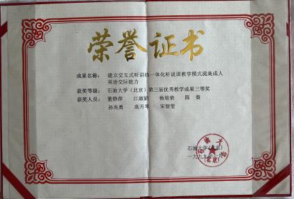 她精通因材施教之道,巧妙融合理論與實踐,讓學生在輕松愉悅的氛圍中領略英語的魅力,評教多次位列全校前茅。她注重培養學生的交際能力,摒棄單一的輸入式教學,轉而采用講練結合的模式,以實現語言交際為目標,讓學生在實踐中自然習得語言。她用心構建“交互式聽講練一體化”教學模式并獲得中國石油大學(北京)第三屆優秀教學成果三等獎。