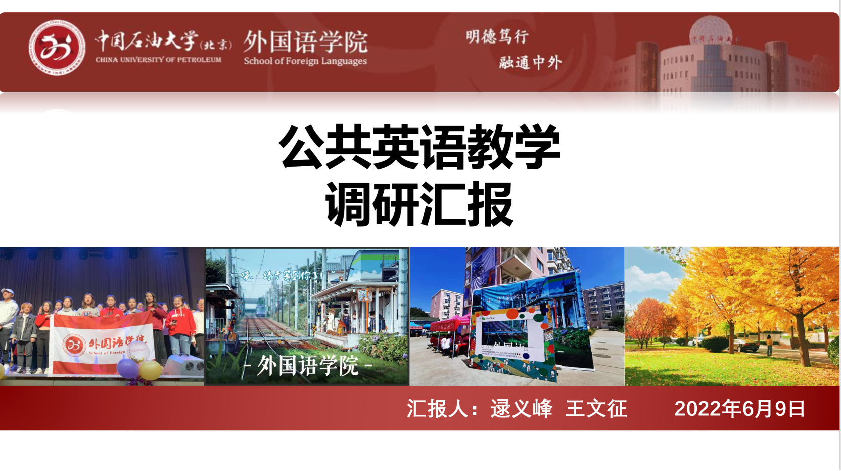 逯義峰副院長首先介紹了公共英語教學改革的背景,并匯報了對相關高校調研情況。他從學時學分、分級教學、教學內容等方面,介紹了前期對十余所兄弟院校的公共英語教學調研情況。他指出,兄弟院校對我校以能源學術英語為特色的公共英語教學模式表示了肯定和支持;同時,兄弟院校公共英語教學的許多模式和方法,也為我校的教學改革提供了參考和借鑒。