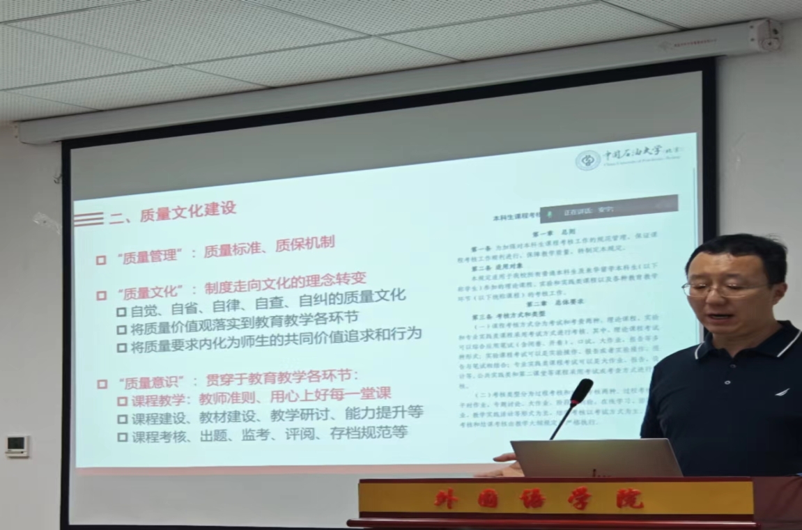 最后,逯義峰指出這種質量意識和文化的構建不應僅限于正式評估階段,而應貫穿于每一學期的教育教學過程中。他鼓勵全體教師在日常工作中時刻保持質量意識,將質量文化理念深植于心,努力構建質量文化氛圍。通過不斷的學習、交流和反思,共同推動學院教學質量和保障能力的持續提升,為培養更多具有國際視野和跨文化交際能力的高素質外語人才貢獻力量。
