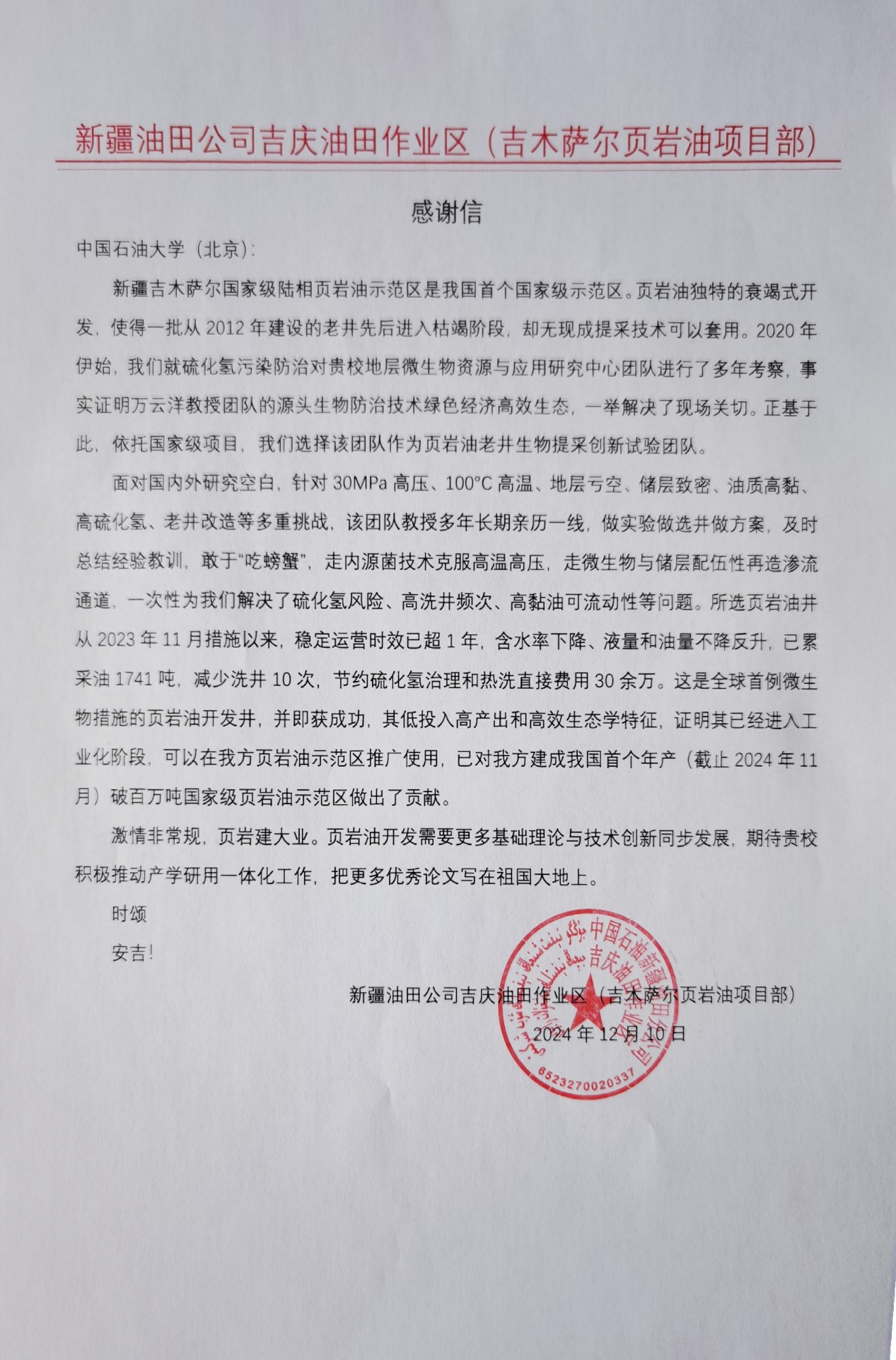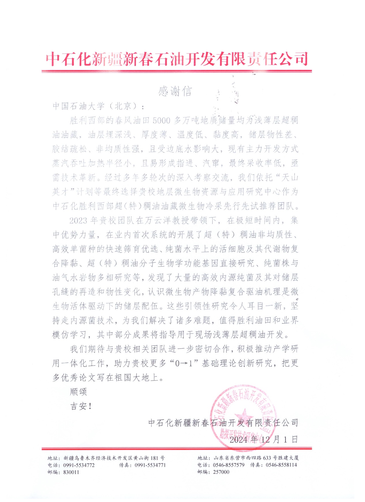 中石化新疆新春石油開發有限責任公司、中石油新疆油田公司吉慶油田作業區(吉木薩爾頁巖油項目部)分別向中國石油大學(北京)發來感謝信,對學校參加勝利西部淺薄層超(特)稠油生物冷采技術研發、非常規頁巖油老井生物提采研發的萬云洋教授及其團隊表示感謝。