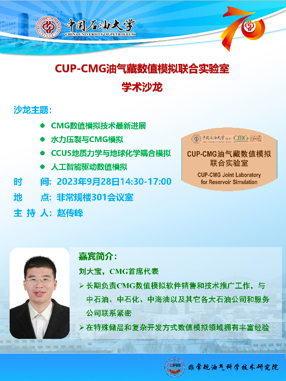 2023年9月28日,適逢中國石油大學(北京)建校70周年校慶,我院成功舉辦“CUP-CMG油氣藏數值模擬聯合實驗室學術沙龍”。本次活動由CUP-CMG油氣藏數值模擬聯合實驗室主辦,由非常規油氣科學技術研究院承辦,邀請到CMG中國區專家團隊劉大寶首席代表進行技術指導。沙龍活動包括四項主題,分別為《CMG數值模擬技術最新進展》、《水力壓裂與CMG模擬》、《CCUS地質力學與地球化學耦合模擬》以及《人工智能驅動數值模擬》。近年來,CMG油氣藏數值模擬軟件緊緊圍繞非常規油氣開發以及儲氣儲氫技術在全球范圍內的蓬勃發展以及人工智能技術的突飛猛進,在模擬功能以及運行性能方面做出了與之匹配的顯著進展,完全能夠滿足全校師生的教學科研需求。在技術交流環節,線上線下的參會師生圍繞各自的研究方向以及研究過程中遇到的實際問題,與CMG專家進行了深入有效的探討和交流。