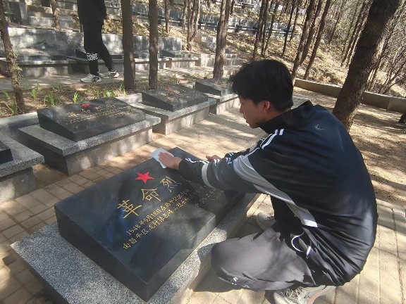 緊接著,同學們走入墓區,依次用毛巾細細擦拭每個墓碑上用金漆涂寫的先輩英明。瞻仰烈士們的事跡,我們深感幸福與和平的不易。這是地物學子對墓碑之下英靈的祭奠,深埋在祖國大地的片片忠骨必將千古長存,被歷代中華兒女永遠銘記。