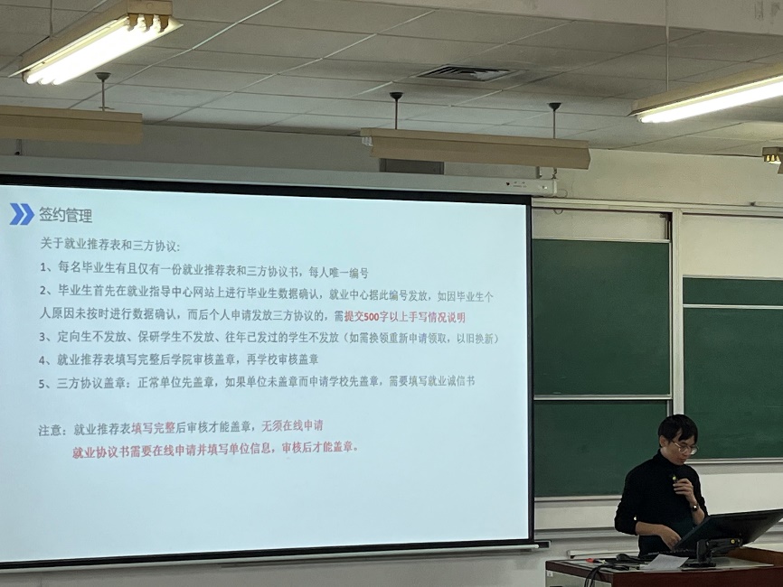 會(huì)議就當(dāng)前的疫情防控政策進(jìn)行解釋?zhuān)瑫r(shí)為學(xué)生梳理了就業(yè)流程、培訓(xùn)了就業(yè)指導(dǎo)網(wǎng)站的實(shí)用以及招聘信息的獲取。同時(shí)就違約、改派等重點(diǎn)問(wèn)題進(jìn)行了著重說(shuō)明。