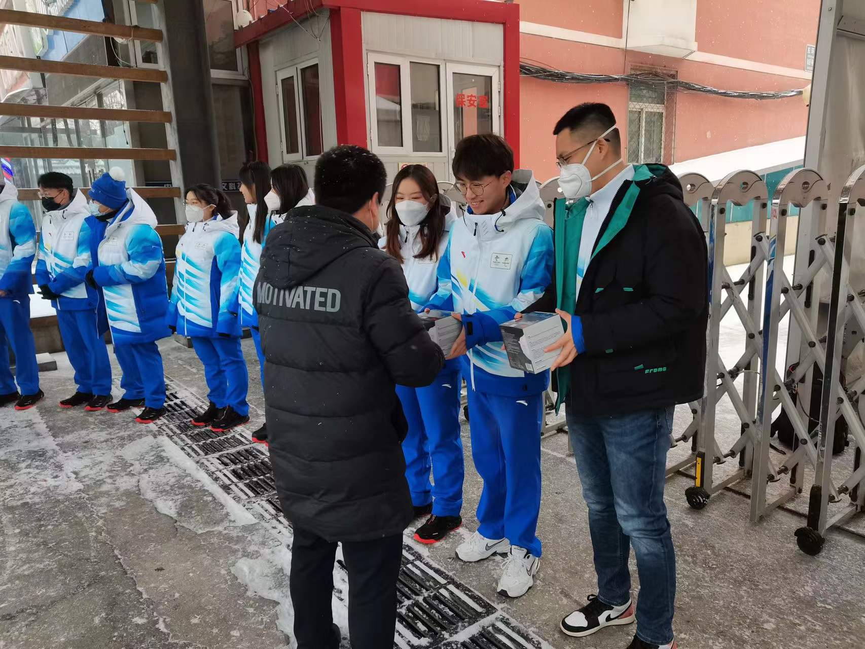 最后,全體班子成員為志愿者們發放口罩、免洗消毒液等物資并與志愿者們合影留念,共同祝福他們順利完成冬奧志愿服務工作,平安凱旋。