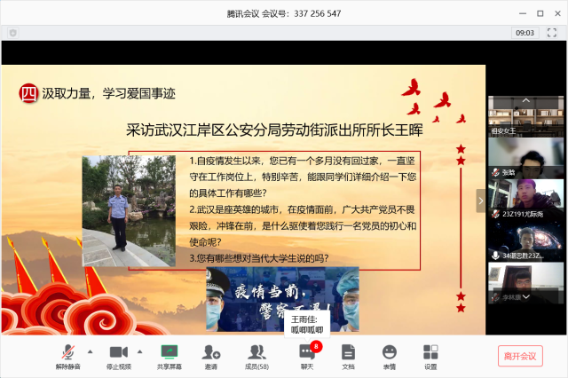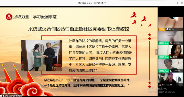 本次“云班會”遠程連線武漢市公安局江岸分局勞動街派出所所長王暉、武漢蔡甸區蔡甸街辦事處正街社區黨委副書記龔姣姣和戰“疫”志愿者——中國地質大學(武漢)自動化類專業23Z191班肖緯琦同學,與同學們分享戰 “疫”故事、講述愛國情懷、共話青春擔當,并邀請中石大馬克思主義學院曹培強教授作為點評嘉賓,對比國內外抗疫所采取的態度、措施和效果,進一步堅定青年學生“四個自信”。
