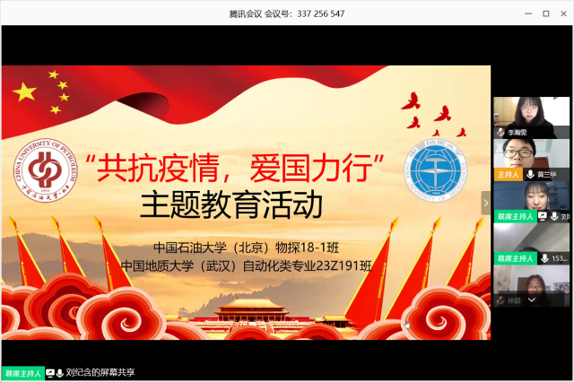 為落實教育部及學校相關部署要求,把抗擊疫情斗爭作為推進學生思想政治教育的生動教材,3月21日晚,中國石油大學(北京)物探18-1班與中國地質大學(武漢)自動化類專業23Z191班聯合開展了一場主題為“共抗疫情,愛國力行”的“云班會”。