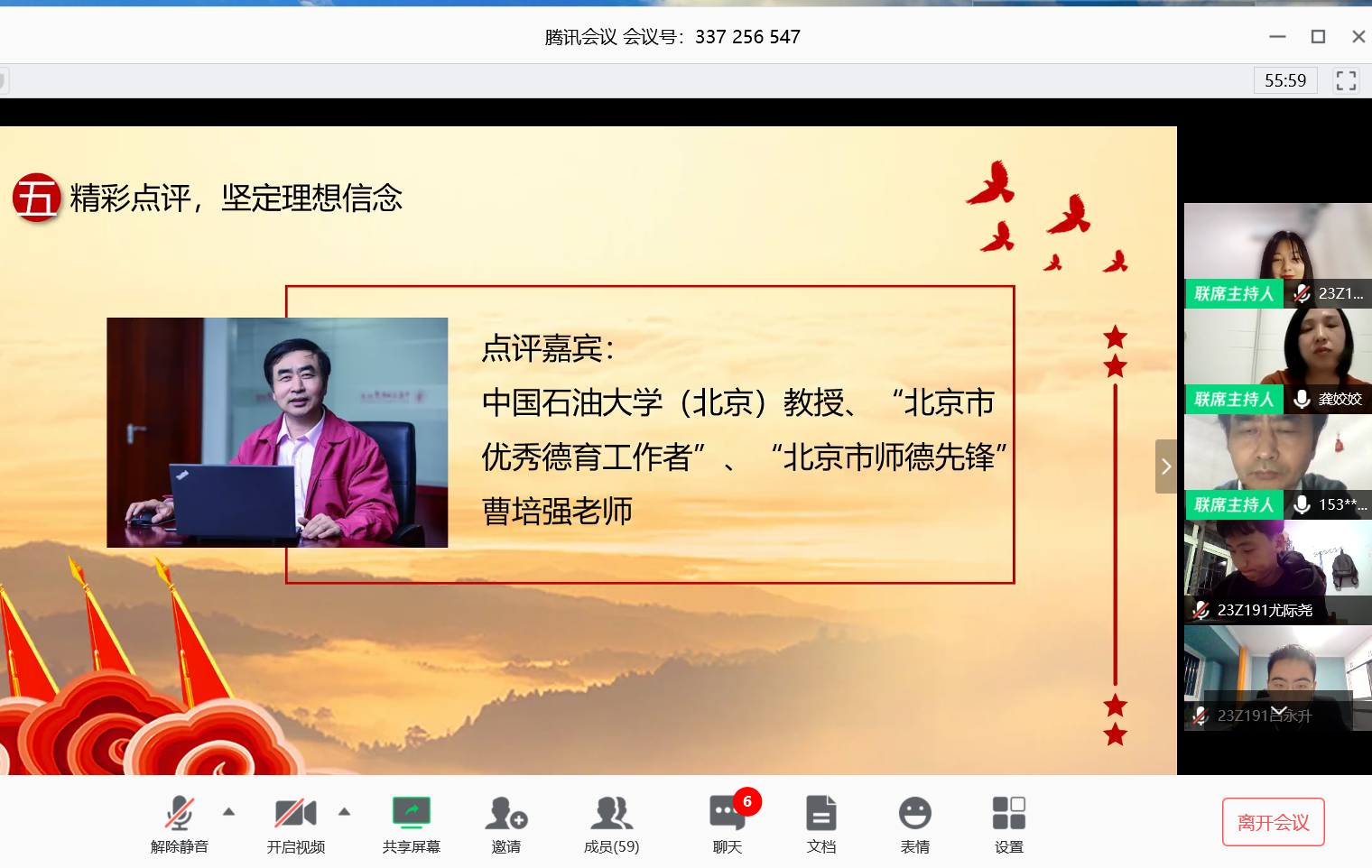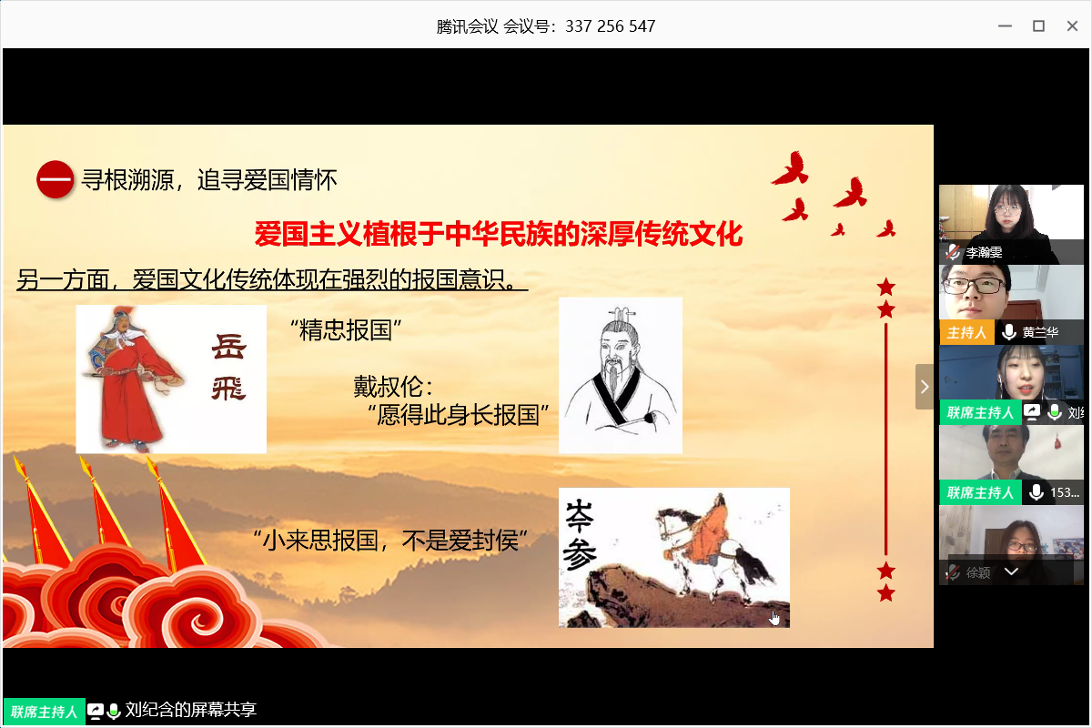 會議伊始,中石大物探18-1班團支書劉紀含通過帶領同學們朗誦古代愛國詩詞,使大家認識到愛國主義植根于中華民族深厚的傳統文化中,并通過回溯中國人民在中國共產黨的領導下浴血奮戰建立新中國、自力更生挺起脊梁、昂首闊步邁入新時代的艱苦歷程,讓同學們認識到愛國主義孕育在中國人民的偉大奮斗歷程中。