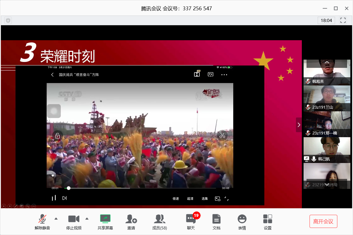 中石大物探18-1班班長韓己航分享了參加慶祝新中國成立70周年群眾游行的經歷。韓己航表示,參訓隊員們不怕苦、不怕累,‘精,精益求精’地刻苦訓練,只為確保關鍵時刻的‘萬,萬無一失’。在講到走過天安門廣場的經歷時,他說:“看見習近平總書記向我們招手的那一刻,我們的愛國熱情一下子就迸發出來了,雖然已經過去半年,但現在內心依然十分激動,參加群眾游行是我最為榮耀的時刻!在彩車落戶學校之后,班級同學在彩車前面學習‘鐵人精神’,紛紛表示要弘揚艱苦奮斗精神,做勇擔時代重任的有為青年。”