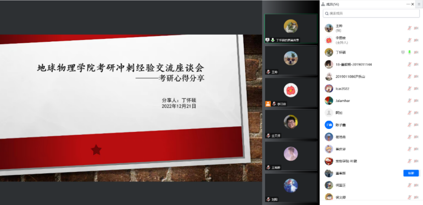 為扎實推進學院育人工作,進一步提升人才培養質量;為激發考研學子的斗志,疏導考研同學心理問題。12月21日下午6點,地球物理學院在線上召開就業指導考研專場座談會,會議主要分為考研經驗交流和考研學生心理疏導。學院黨委書記周玉成、學院黨委副書記陸杭波、學院副院長唐跟陽、學院教師董春暉、學院全體輔導員、2022屆考研高分學生及2023屆全體考研學生參加本次會議,會議由輔導員李田放主持。