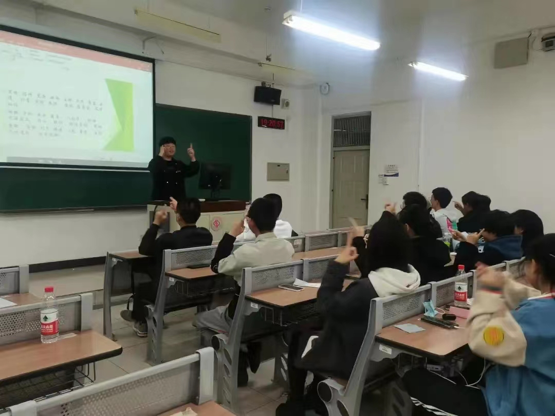 在每周一次的手語培訓(xùn)課上,大家認(rèn)真地學(xué)習(xí)部長教的每一個(gè)動(dòng)作、用心傾聽和感受手語帶來的魅力。在此之前,大家對(duì)手語的認(rèn)知還停留在書本與電影情節(jié)當(dāng)中,手語團(tuán)的培訓(xùn)課讓大家發(fā)現(xiàn)手語不僅僅是獨(dú)屬于聾啞人的交流方式,更是一門藝術(shù)的語言。大家在課堂上不僅學(xué)會(huì)了簡單的生活用語,還學(xué)會(huì)了一些特有詞匯和句子的表達(dá),如綠色環(huán)保、愛國精神等相關(guān)的詞匯句子。