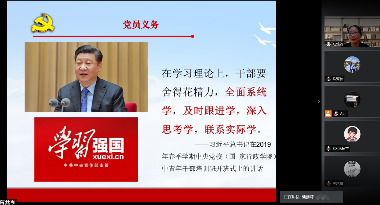 陸雅莉結(jié)合我國疫情防控戰(zhàn)斗中涌現(xiàn)出的優(yōu)秀黨員典型事跡,與參會黨員一起重溫了《中國共產(chǎn)黨章程》中關(guān)于黨員的重要內(nèi)容,包括黨員條件,黨員性質(zhì)、黨員義務(wù)、入黨誓詞四個部分。她希望畢業(yè)生黨員在以后的學(xué)習(xí)和工作中能夠牢記黨員身份,履行黨員義務(wù),做到“平常時候看得出來,關(guān)鍵時候站得出來,危難時候豁得出來”,時時處處發(fā)揮黨員先鋒模范作用;要堅持用好“學(xué)習(xí)強(qiáng)國”平臺,加強(qiáng)理論學(xué)習(xí),用理論武裝頭腦;要把入黨誓詞內(nèi)化于心、外化于行,時刻保持對黨的忠誠,用實際行動踐行對黨的誓言承諾。