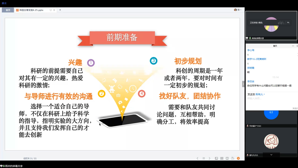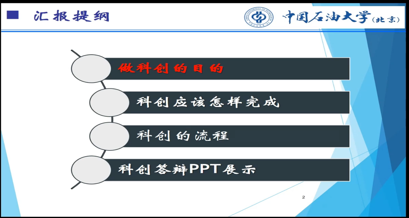 物探15級劉繼偉同學介紹了做科創(chuàng)的初心以及大致流程,并用自己的答辯PPT為范例提醒大家制作PPT的注意事項。物探16-2班韓奕同學介紹了自己做項目的心得體會,分享了立項書填寫的注意事項,幫助大家進一步走進科創(chuàng),對科創(chuàng)有了更加清晰的認識。