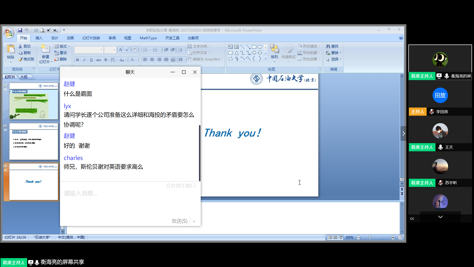 本次就業經驗分享活動利用“騰訊會議”平臺開展,活動邀請到地球物理學院地球物理學17級碩士研究生衡海亮和地質資源與地質工程17級碩士研究生蘇宇昕擔任主講。來自全校各專業各年級近100名同學共同“線上”學習就業經驗。衡海亮結合自己海投近千家單位和面試幾十家單位的經驗,分享了“如何進行行業選擇”、“如何有針對性的制作和投遞簡歷”、“筆試、面試應注意的問題”等內容。蘇宇昕結合自己歷經8個月緊張備考,半個月集中訓練,做了3萬道真題,磨壞3件襯衫,最終以筆試第一名的成績被中華人民共和國外交部錄用的寶貴經歷,為大家分享了“公**的準備時間與節奏”、“筆試需要做哪些準備、怎樣復習”、“筆試中行測部分與申論部分考試技巧”等方面的內容。整個活動期間,“線上”聽眾踴躍提問,氣氛活躍,共留言200余條,兩位主講同學就“就業過程中英語水平的重要性”、“就業過程中心理調節”等方面問題與各位同學做深入交流。