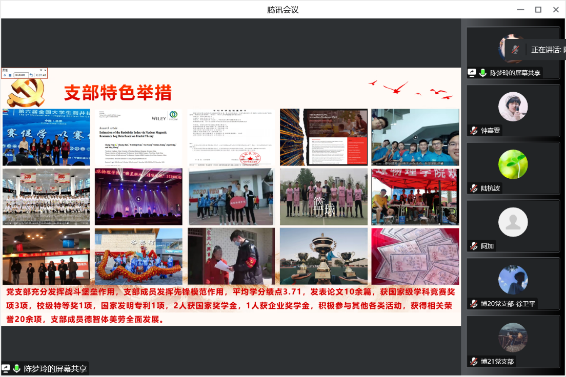 為進一步加強基層黨組織建設,充分發揮學生黨支部戰斗堡壘和學生黨員的先鋒模范作用,不斷增強學生黨支部凝聚力,激勵引導廣大學生在趕、學、比、超中成長成才,2022年12月27日下午,地球物理學院在線上舉辦2022年度學生黨支部工作評比交流會。學院黨委書記周玉成、學院專職組織員徐樟有、學院黨委副書記陸杭波、黨辦院辦主任徐靜、院辦學工黨支部書記馬亞秋、全體輔導員以及學生黨支部代表參加了此次活動,會議由輔導員阿加主持。