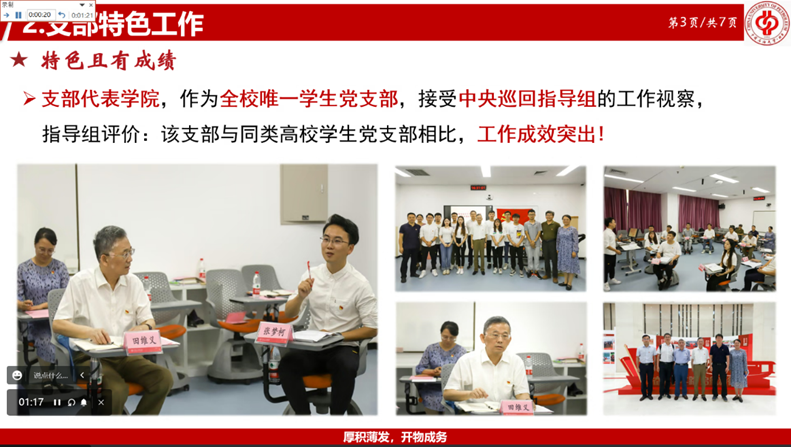 會上,各學生黨支部分別從支部基本情況、主要開展工作、特色活動建設、獲得成果展示、不足之處及今后改進措施等五個方面進行了總結匯報。學院領導針對各學生黨支部的工作匯報進行了點評,充分肯定了優秀黨支部的工作,同時也提出了部分支部所存在的問題和改進建議。