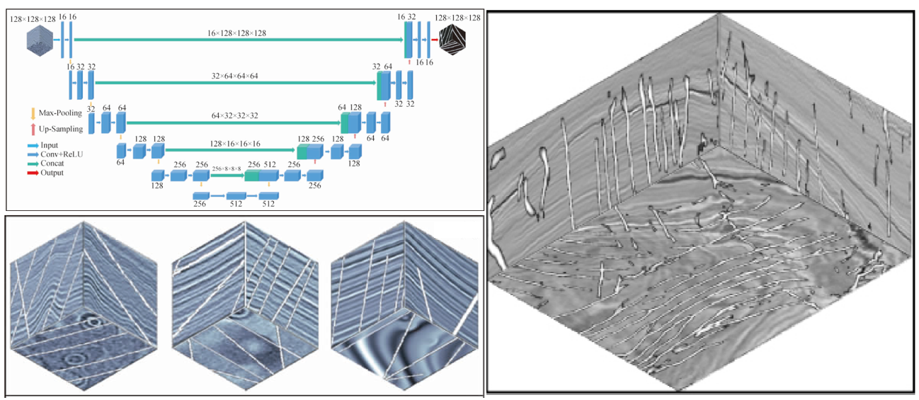 下圖展示了我本科期間做的一項基于監督深度學習的地震斷層自動解釋工作。利用三維合成地震數據與其對應的斷層標簽數據來訓練三維深度卷積神經網絡,訓練好的模型被遷移應用于實際數據,將三維實際數據輸入訓練好的模型,模型能夠輸出對應的斷層概率數據(值域為[0, 1])。這項工作有效地提升了斷層解釋效率,降低了人工成本。