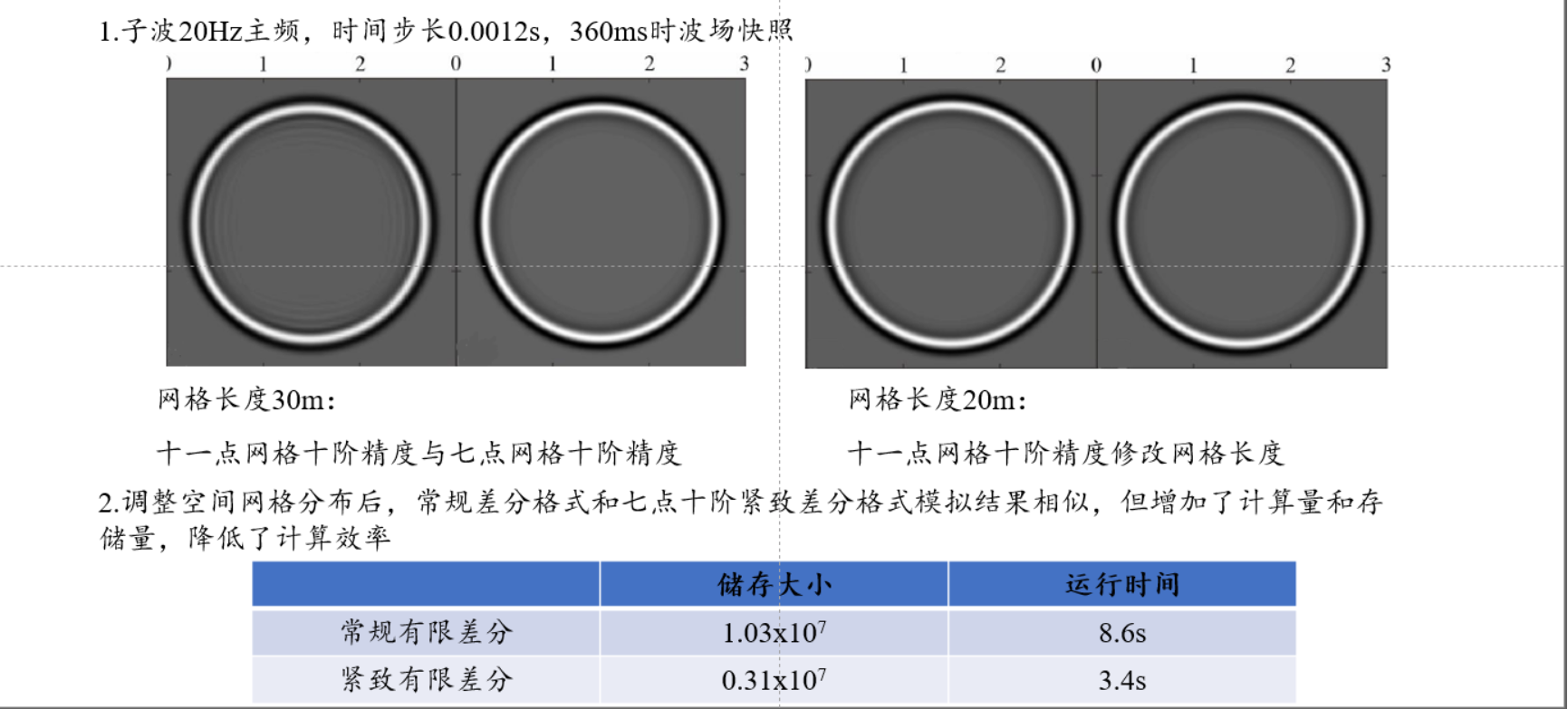 下面是近期做的一個數值模擬,用來驗證有限差分波場模擬過程中,緊致差分格式模擬在與常規差分格式模擬結果相同時,計算量和存儲量減少,計算效率提高。