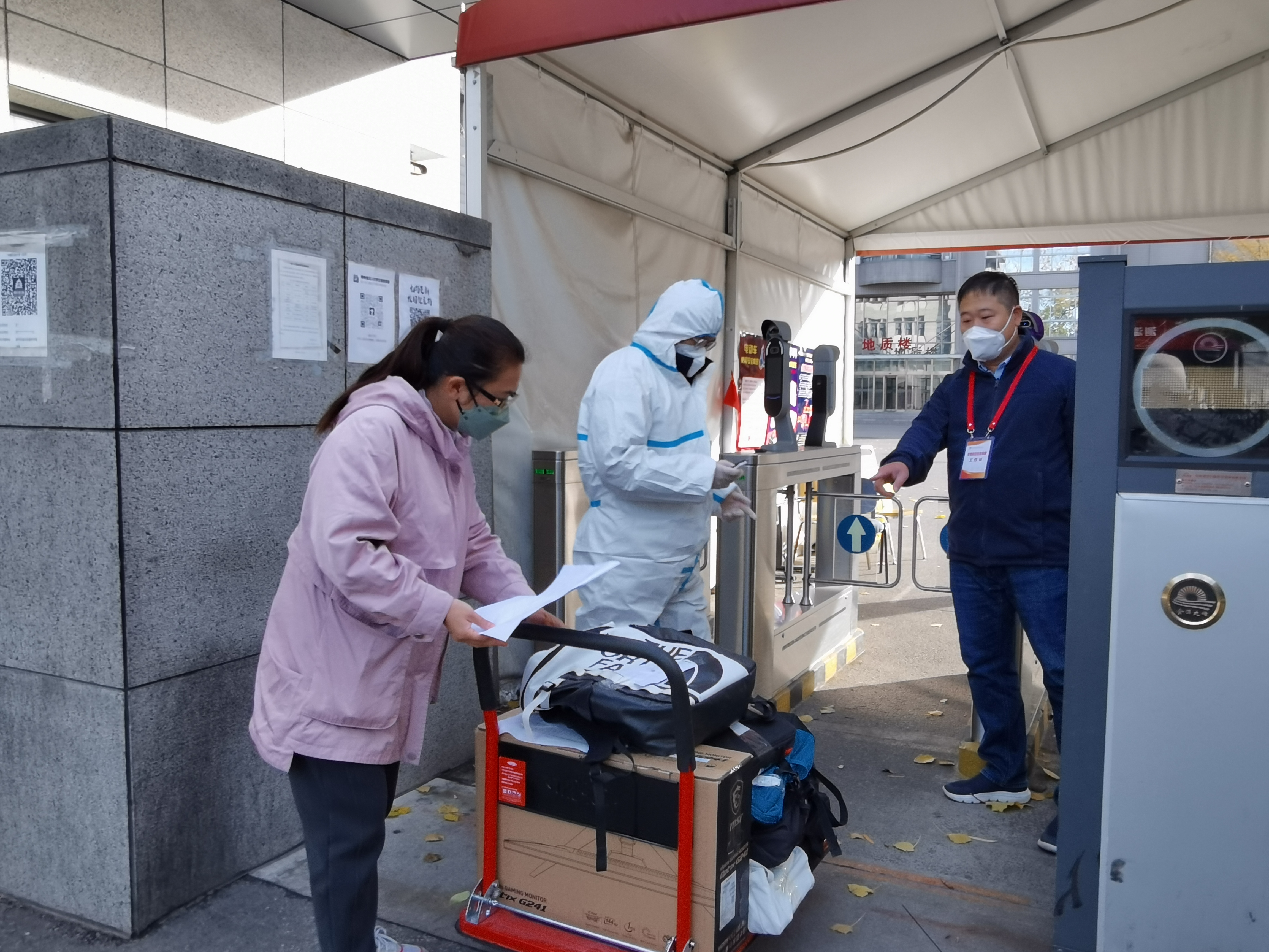 鑒于此次校園封控事發突然,很多學生的電腦等學習用品還存放在學生工作室,學院黨委牽頭,輔導員和院辦職員等老師迅速行動,組建了一支搬運隊伍,輔導員組織校內學生幫忙打包學生物資,院辦職員等老師在校外接應,在徐靜老師的帶領下,老師們及時將學生所需物資送到學生所在校區。徐靜老師多次往返于南校園和東校園,不僅為封控學生轉運物資,還為在校教師及時補充防疫物資等生活用品。