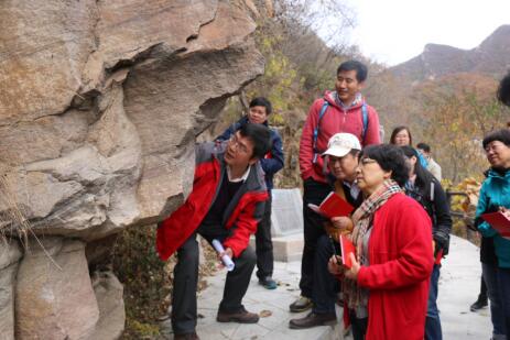 10月28日,實踐團一行赴薊縣國家地質公園中上元古界剖面保護區進行了考察。地球科學學院教授季漢成、王貴文結對剖面的構造、沉積現象進行了講解,針對疊層石類型、地層沉積環境、斷層發育特征等現象與青年教師們展開熱烈討論。
