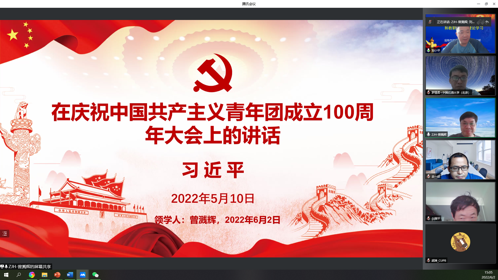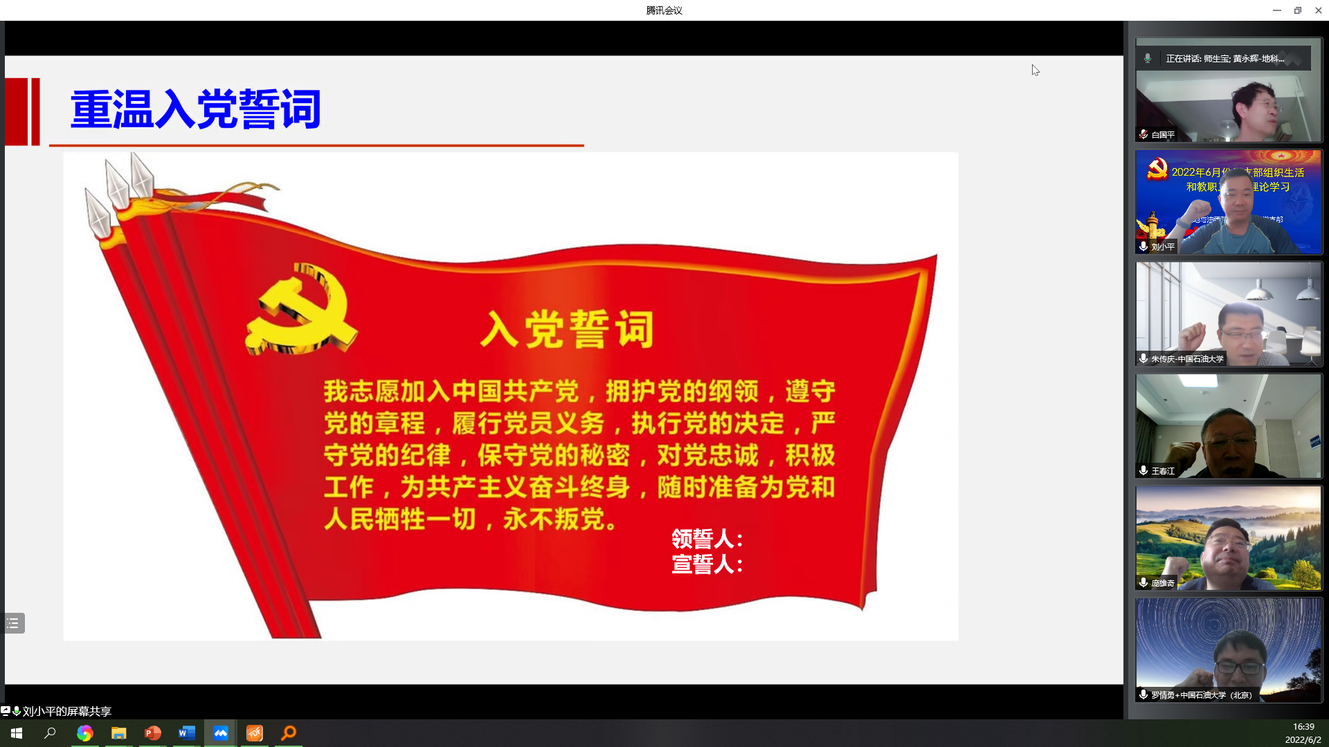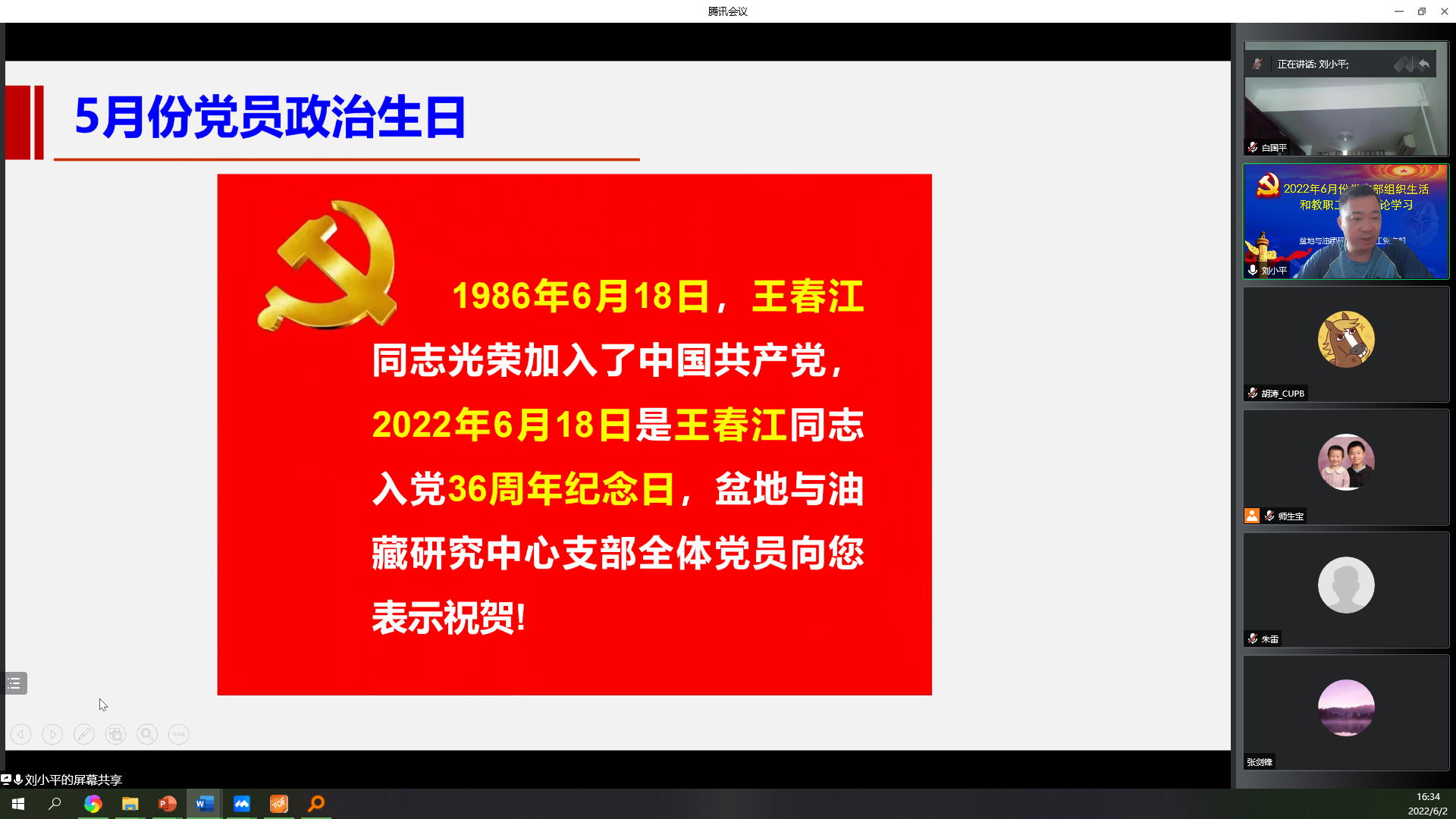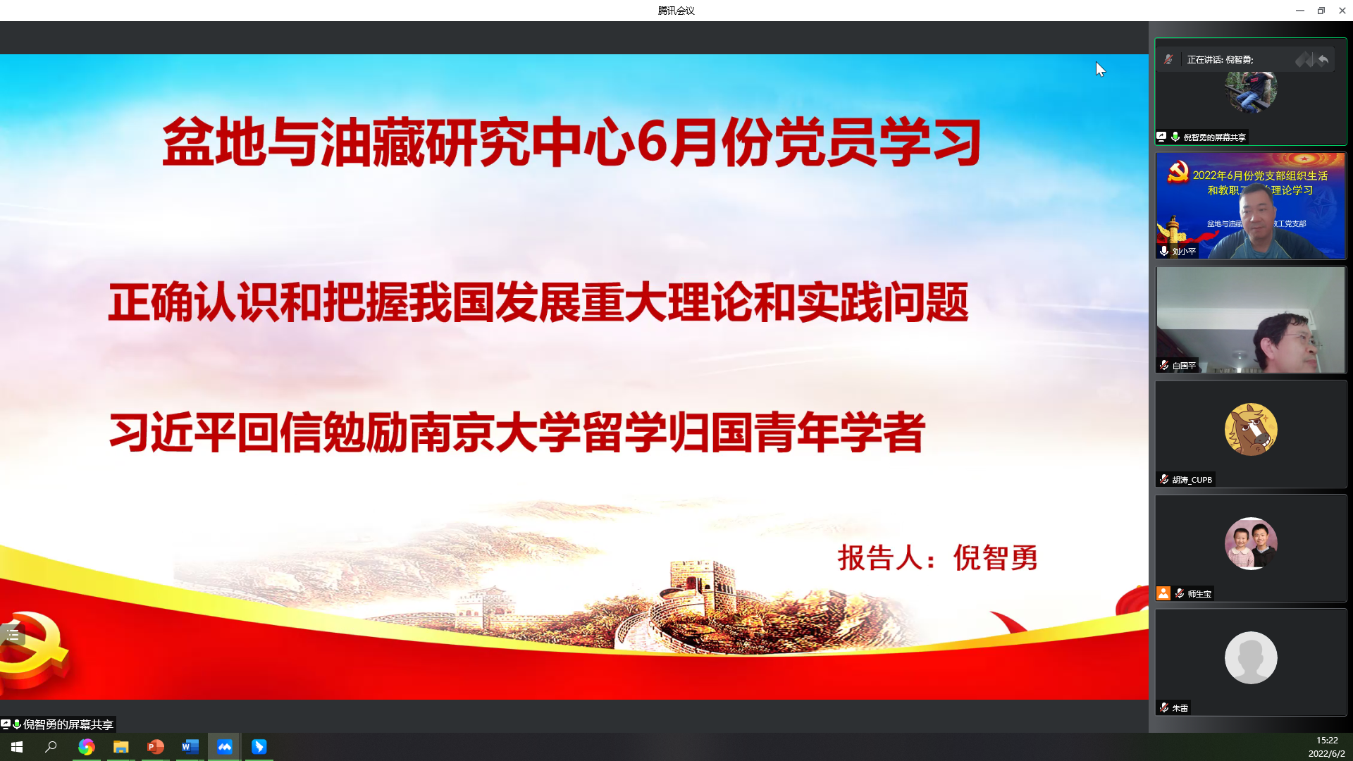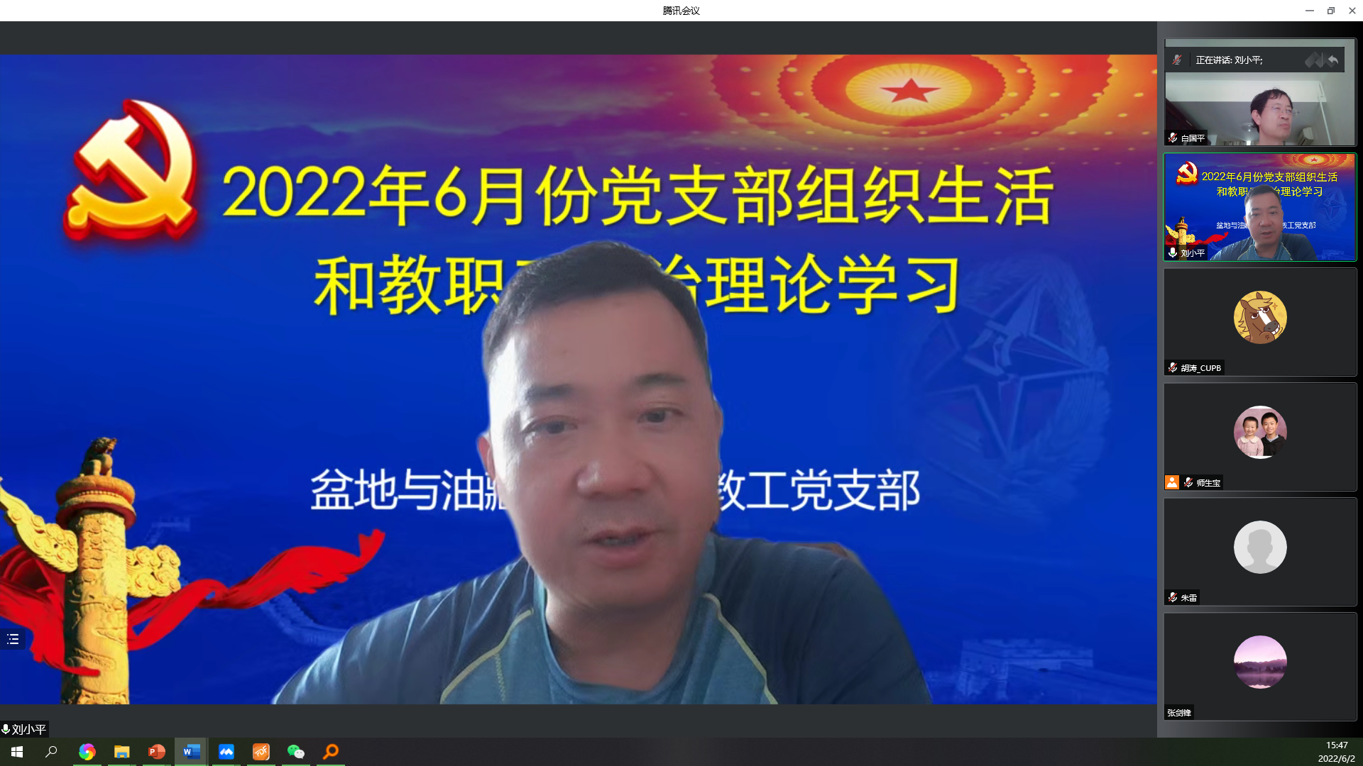 2022年6月2日下午,盆地與油藏研究中心教工黨支部組織全體教職工線上進行了“黨支部組織生活和教職工政治理論學習”,共有38名黨員和教職工參加了本次組織生活會,會議由劉小平同志主持,會議分為兩個階段。