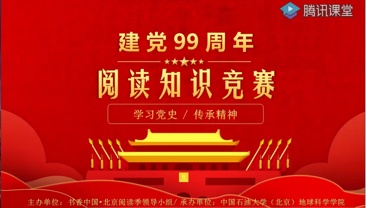 7月6日下午,為慶祝建黨99周年,中國石油大學(北京)地球科學學院聯合書香中國·北京閱讀季領導小組在騰訊課堂中舉辦了“建黨99周年”閱讀知識競賽活動。