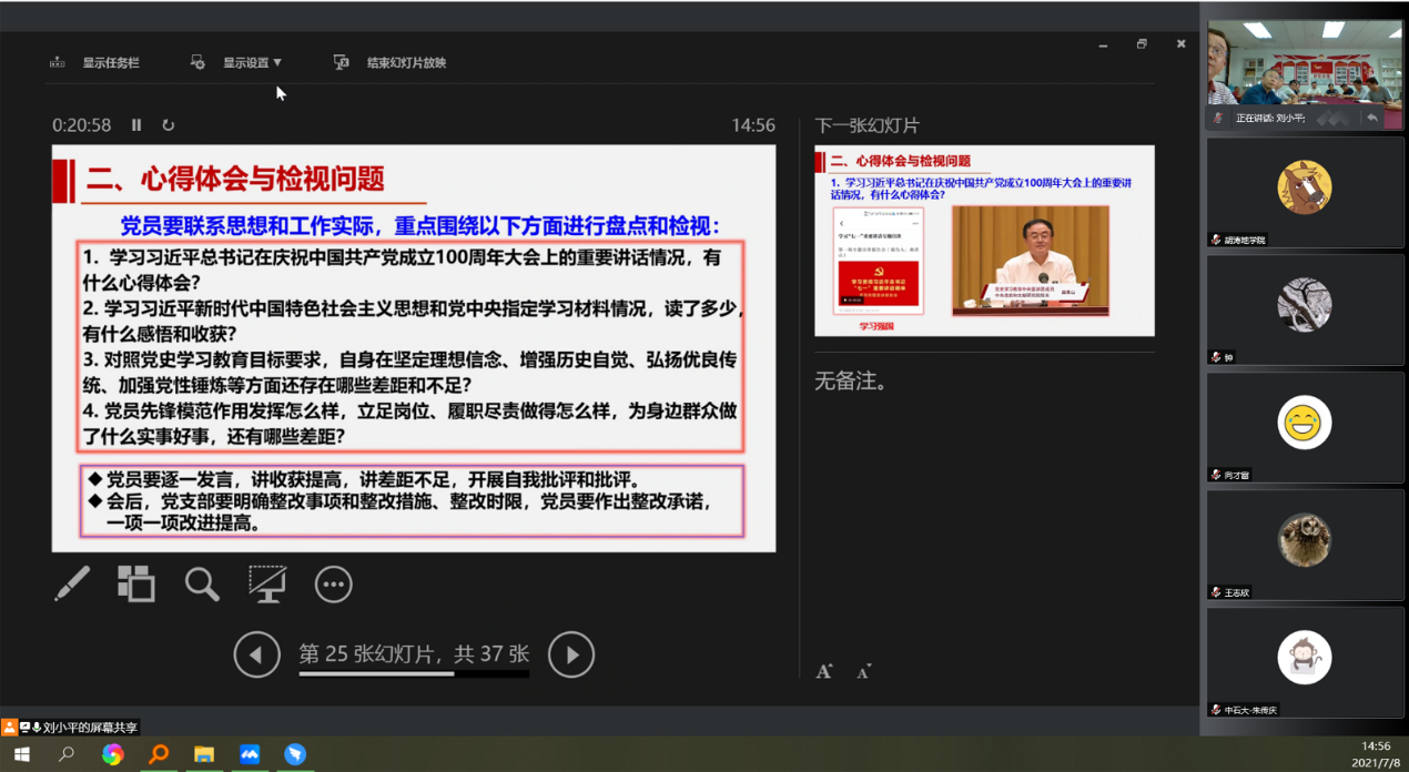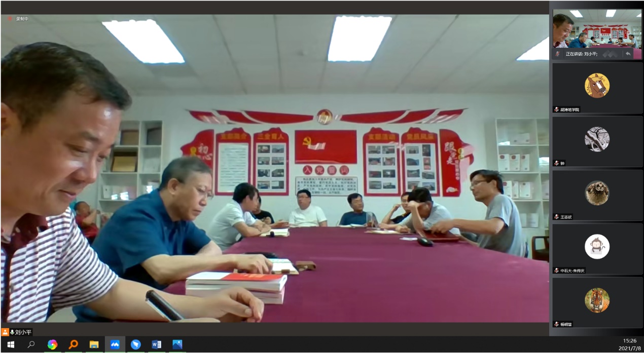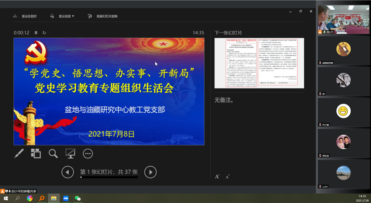 2021年7月8日下午,地球科學學院盆地與油藏研究中心教工黨支部召開“學黨史、悟思想、辦實事、開新局”黨史學習教育專題組織生活會,會議通過線下(在地質樓721黨員活動室)和線上(騰訊會議)兩種形式展開,支部共有26名黨員參加了,其中3名正在遼寧興城帶本科生野外綜合地質實習的教工黨員線上參加。