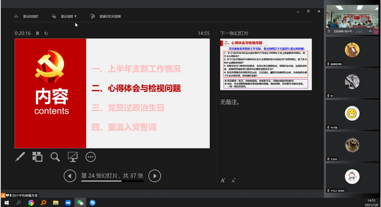 支部書記劉小平介紹了7月份學習要點,回顧了習近平總書記在慶祝中國共產黨成立100周年大會上的重要講話,強調了學習的必要性。學習分為四個部分:首先,劉小平系統匯報了2021年上半年支部工作情況,并對如何做好下步工作做了詳盡的規劃;其次,圍繞“聆聽習近平總書記在100周年大會上的重要講話情況有什么心得體會”、“學習習近平新時代中國特色社會主義思想和黨中央指定學習材料有什么感悟”、“對照黨史學習教育目標要求中自身還存在哪些差距和不足”、“如何立足崗位、履職盡責發揮黨員先鋒模范作用”這四個方面,所有黨員同志逐一發言,開展了自我批評。其中,劉小平首先帶頭展開了批評與自我批評,認為我們應該發揮共產黨人的優良傳統,吃水不忘挖井人,在做好自身本質工作的同時,要多加入到為身邊群眾做實事好事的工作中去,并介紹了支部朱雷同志積極參加社區工作為身邊群眾做好事的事例,鼓勵同志們向朱雷學習;隨后朱雷同志詳細分享了為身邊群眾做好事的心路歷程;朱傳慶認為,學黨史不是任務,更不是家庭作業,我們需要將黨史學習融入到日常生活中,用心感悟才能領會精要;向才富認為我們處于和平盛世,應該努力將自身融入到國家建設中,在搞好科研工作的同時,更要為石油工業培養優秀人才。隨后,劉小平主持為楊明慧、邱楠生、王洪玉3名黨員過政治生日,并贈送了政治生日賀卡及生日禮物,最后,所有黨員重溫了入黨誓詞,進一步強化了政治儀式感。