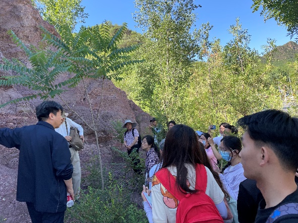 參觀結(jié)束后,師生們乘車赴南雁路田莊村附近開展野外油氣地質(zhì)教學(xué)實踐活動,幾位老師帶學(xué)生們觀察剖面,深入講解相關(guān)的構(gòu)造、沉積知識,分析探討露頭的巖性、巖相和斷層等。雖然天氣十分炎熱,但同學(xué)們依然學(xué)習(xí)熱情高漲,積極討論并和老師交流學(xué)習(xí)。